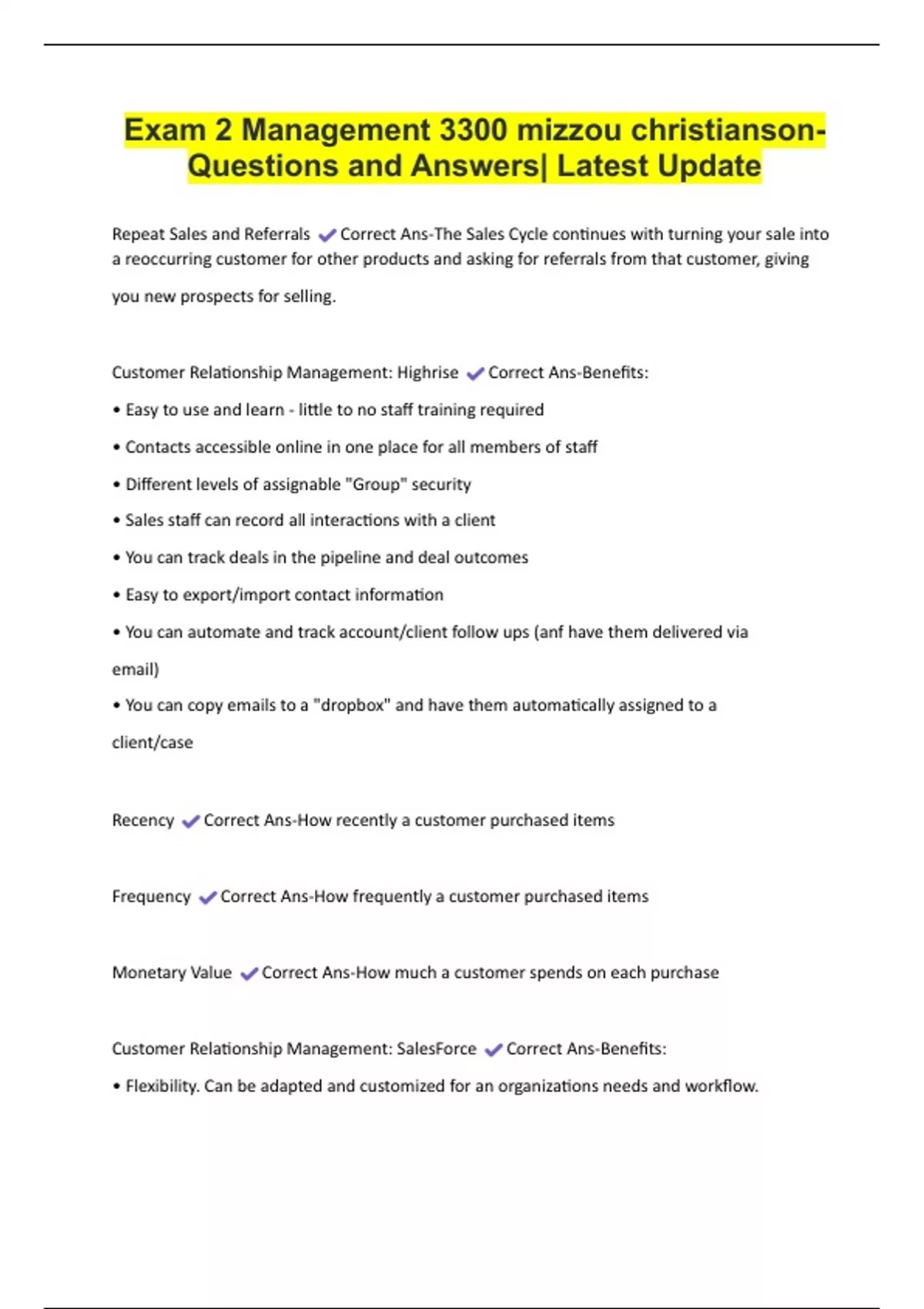 Customer Relationship Management: Highrise Correct Ans-Benefits: