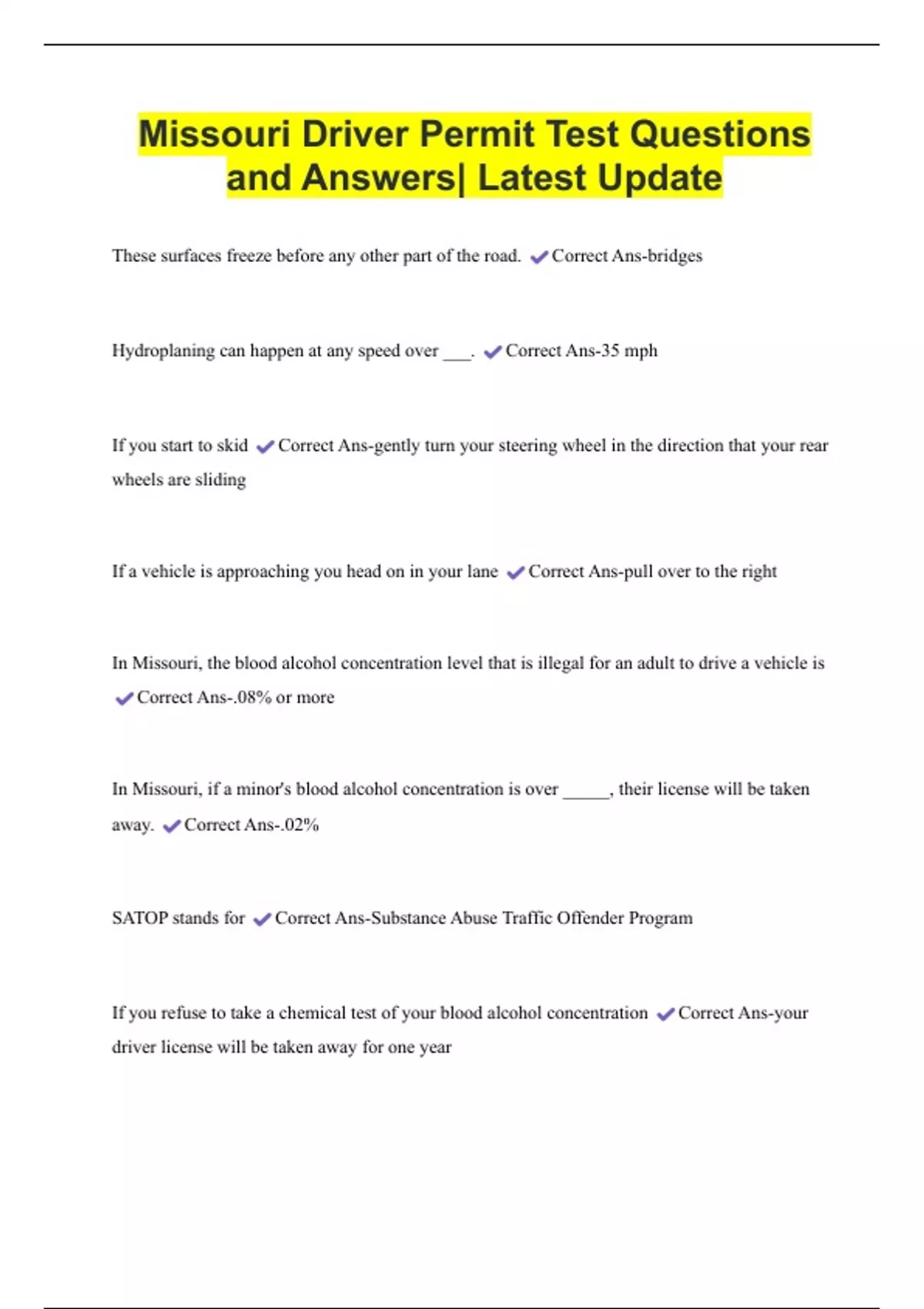 Missouri Driver Permit Test Questions and Answers| Latest Update