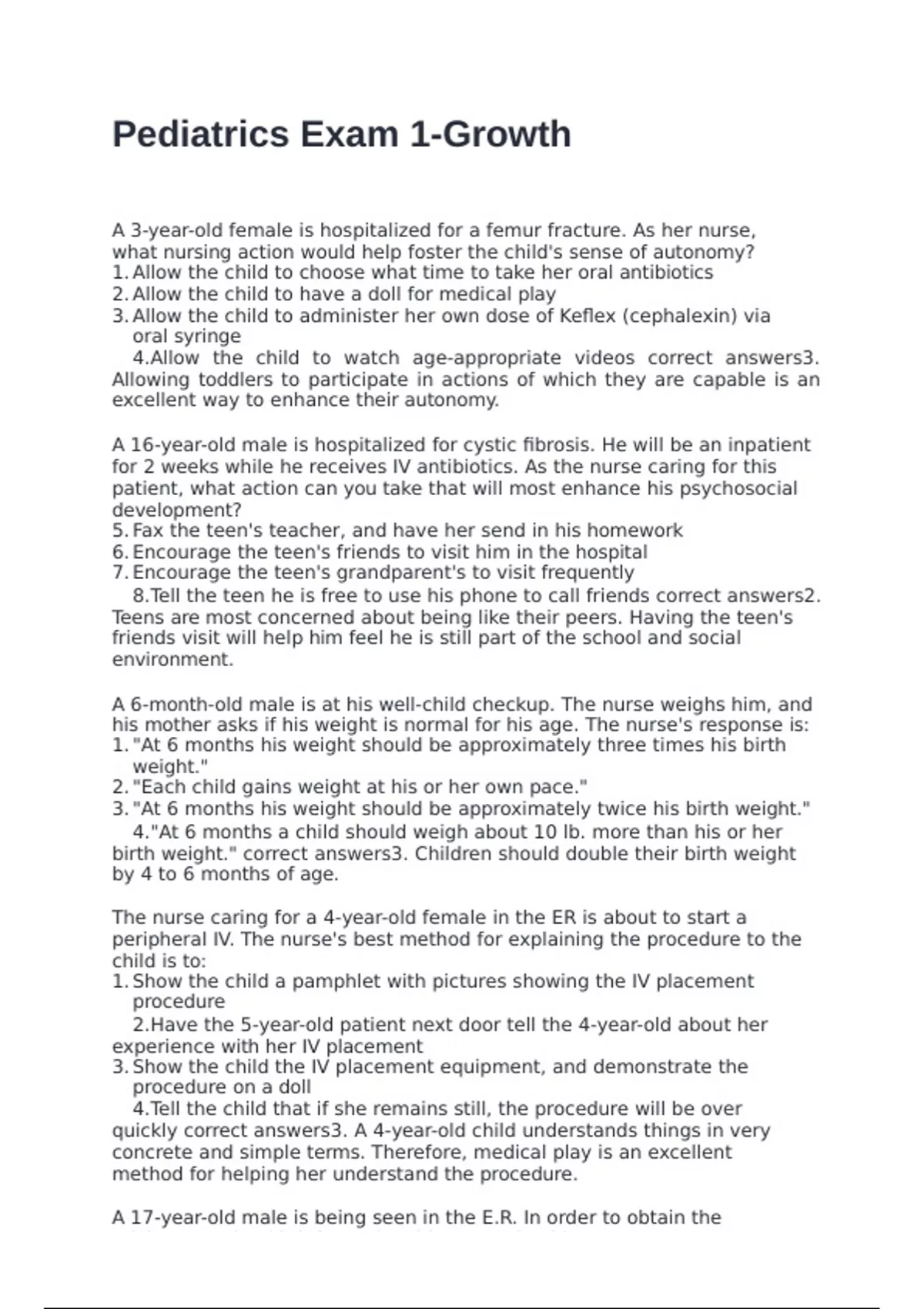 A 3-year-old female is hospitalized for a femur fracture. As her nurse, what nursing action would help foster the child's sense of autonomy? 1. Allow the child to choose what time to take her oral antibiotics 2. Allow the child to have a doll for medical play 3. Allow the child to administer her own dose of Keflex (cephalexin) via oral syringe 4. Allow the child to watch age-appropriate videos correct answers3. Allowing toddlers to participate in actions of which they are capable is an excellent way to enhance their autonomy. A 16-year-old male is hospitalized for cystic fibrosis. He will be an inpatient for 2 weeks while he receives IV antibiotics. As the nurse caring for this patient, what action can you take that will most enhance his psychosocial development? 1. Fax the teen's teacher, and have her send in his homework 2. Encourage the teen's friends to visit him in the hospital 3. Encourage the teen's grandparent's to visit frequently 4. Tell the teen he is free to use his phone to call friends correct answers2. Teens are most concerned about being like their peers. Having the teen's friends visit will help him feel he is still part of the school and social environment. A 6-month-old male is at his well-child checkup. The nurse weighs him, and his mother asks if his weight is normal for his age. The nurse's response is: 1. "At 6 months his weight should be approximately three times his birth weight." 2. "Each child gains weight at his or her own pace." 3. "At 6 months his weight should be approximately twice his birth weight." 4. "At 6 months a child should weigh about 10 lb. more than his or her birth weight." correct answers3. Children should double their birth weight by 4 to 6 months of age. The nurse caring for a 4-year-old female in the ER is about to start a peripheral IV. The nurse's best method for explaining the procedure to the child is to: 1. Show the child a pamphlet with pictures showing the IV placement procedure 2. Have the 5-year-old patient next door tell the 4-year-old about her experience with her IV placement 3. Show the child the IV placement equipment, and demonstrate the procedure on a doll 4. Tell the child that if she remains still, the procedure will be over quickly correct answers3. A 4-year-old child understands things in very concrete and simple terms. Therefore, medical play is an excellent method for helping her understand the procedure. A 17-year-old male is being seen in the E.R. In order to obtain the adolescent's health information, his nurse should: 1. Interview the adolescent using direct questions