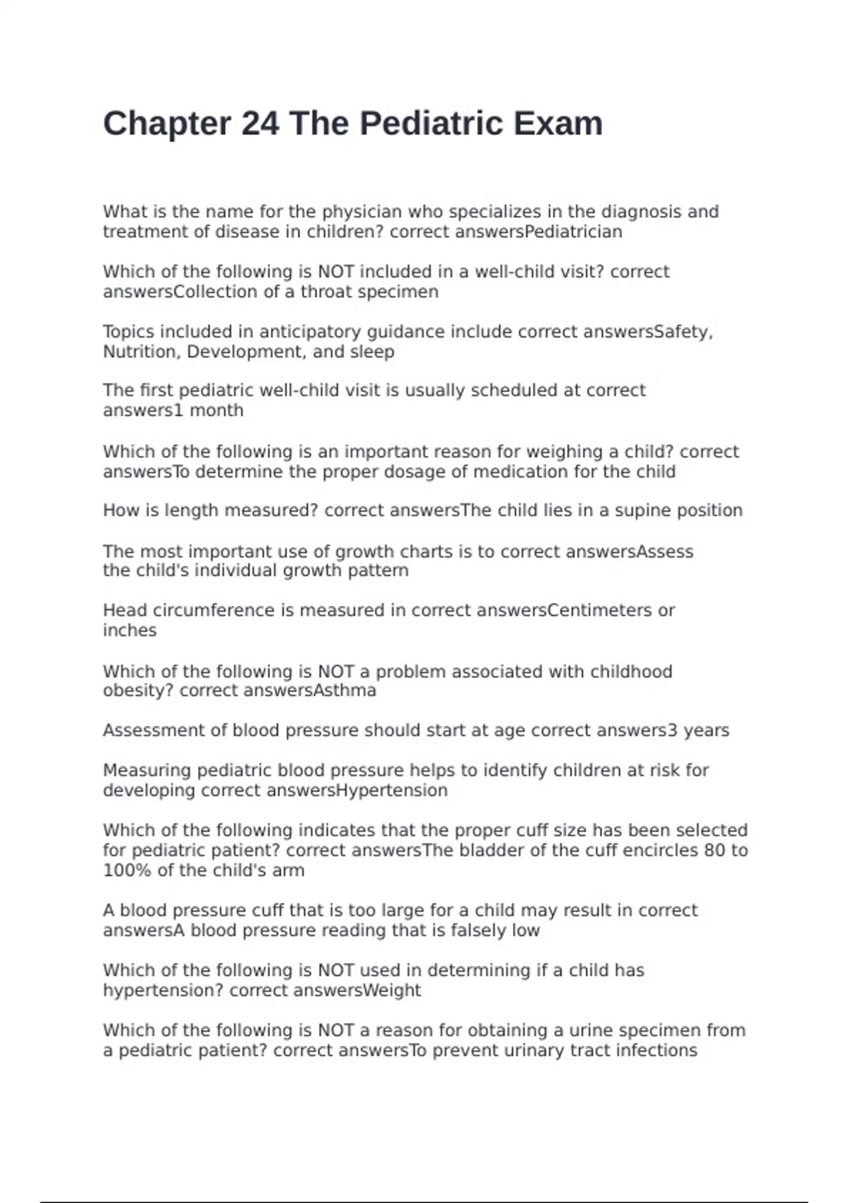 What is the name for the physician who specializes in the diagnosis and treatment of disease in children? correct answersPediatrician Which of the following is NOT included in a well-child visit? correct answersCollection of a throat specimen Topics included in anticipatory guidance include correct answersSafety, Nutrition, Development, and sleep The first pediatric well-child visit is usually scheduled at correct answers1 month Which of the following is an important reason for weighing a child? correct answersTo determine the proper dosage of medication for the child How is length measured? correct answersThe child lies in a supine position The most important use of growth charts is to correct answersAssess the child's individual growth pattern Head circumference is measured in correct answersCentimeters or inches Which of the following is NOT a problem associated with childhood obesity? correct answersAsthma Assessment of blood pressure should start at age correct answers3 years Measuring pediatric blood pressure helps to identify children at risk for developing correct answersHypertension Which of the following indicates that the proper cuff size has been selected for pediatric patient? correct answersThe bladder of the cuff encircles 80 to 100% of the child's arm A blood pressure cuff that is too large for a child may result in correct answersA blood pressure reading that is falsely low Which of the following is NOT used in determining if a child has hypertension? correct answersWeight Which of the following is NOT a reason for obtaining a urine specimen from a pediatric patient? correct answersTo prevent urinary tract infections