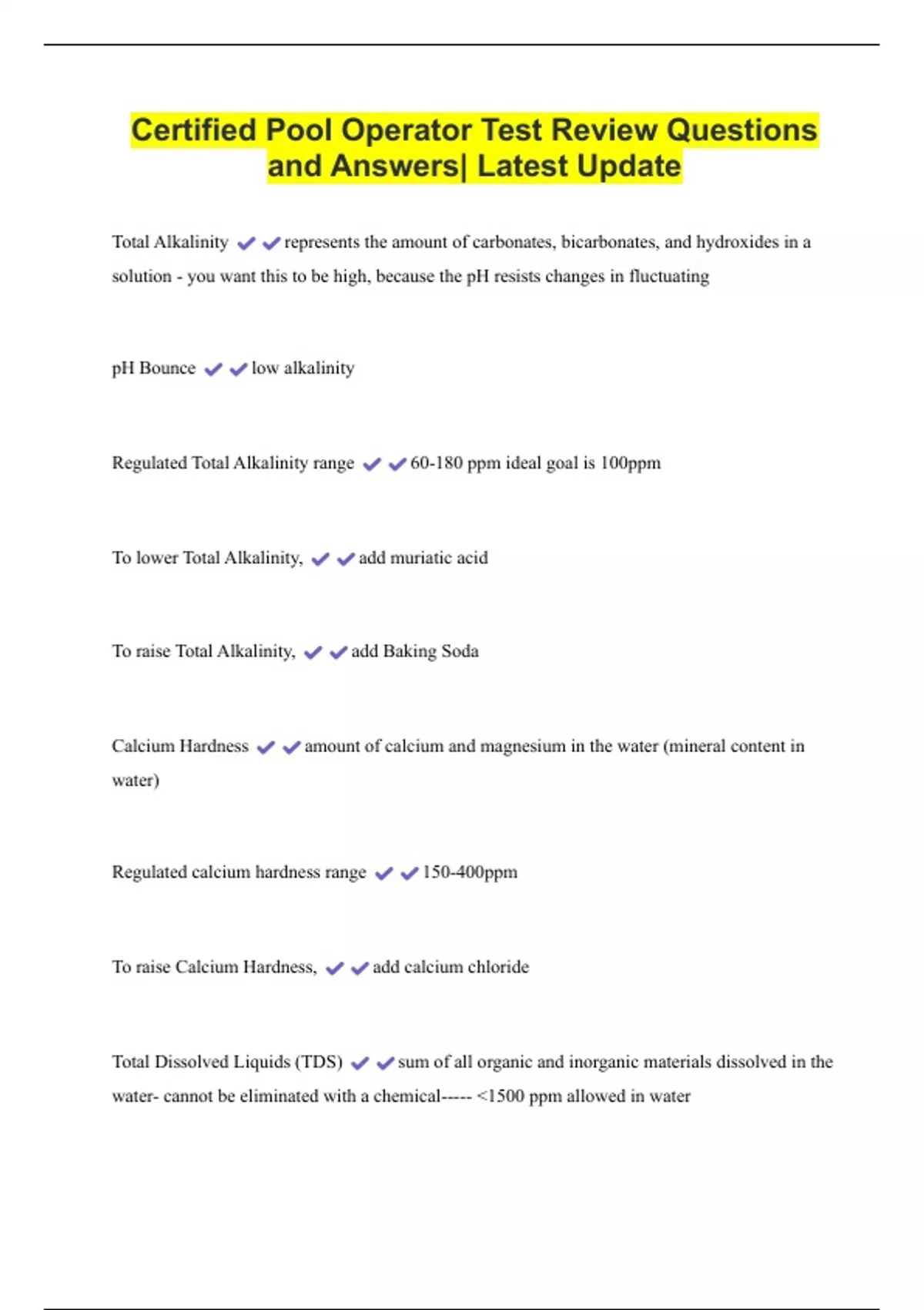 Certified Pool Operator Test Review Questions and Answers| Latest Update