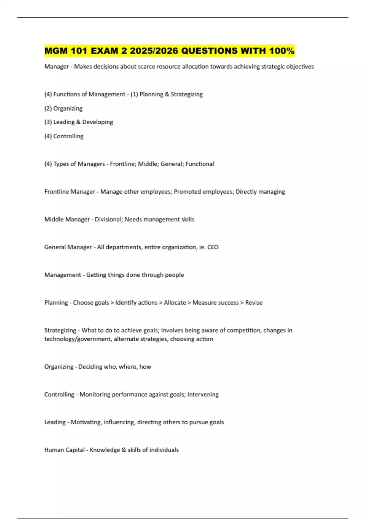 MGM 101 EXAM 2 2025/2026 QUESTIONS WITH 100% Manager - Makes decisions about scarce resource allocation towards achieving strategic objectives (4) Functions of Management - (1) Planning & Strategizing (2) Organizing (3) Leading & Developing (4) Controlling (4) Types of Managers - Frontline; Middle; General; Functional Frontline Manager - Manage other employees; Promoted employees; Directly managing Middle Manager - Divisional; Needs management skills General Manager - All departments, entire organization, ie. CEO Management - Getting things done through people Planning - Choose goals > Identify actions > Allocate > Measure success > Revise Strategizing - What to do to achieve goals; Involves being aware of competition, changes in technology/government, alternate strategies, choosing action Organizing - Deciding who, where, how