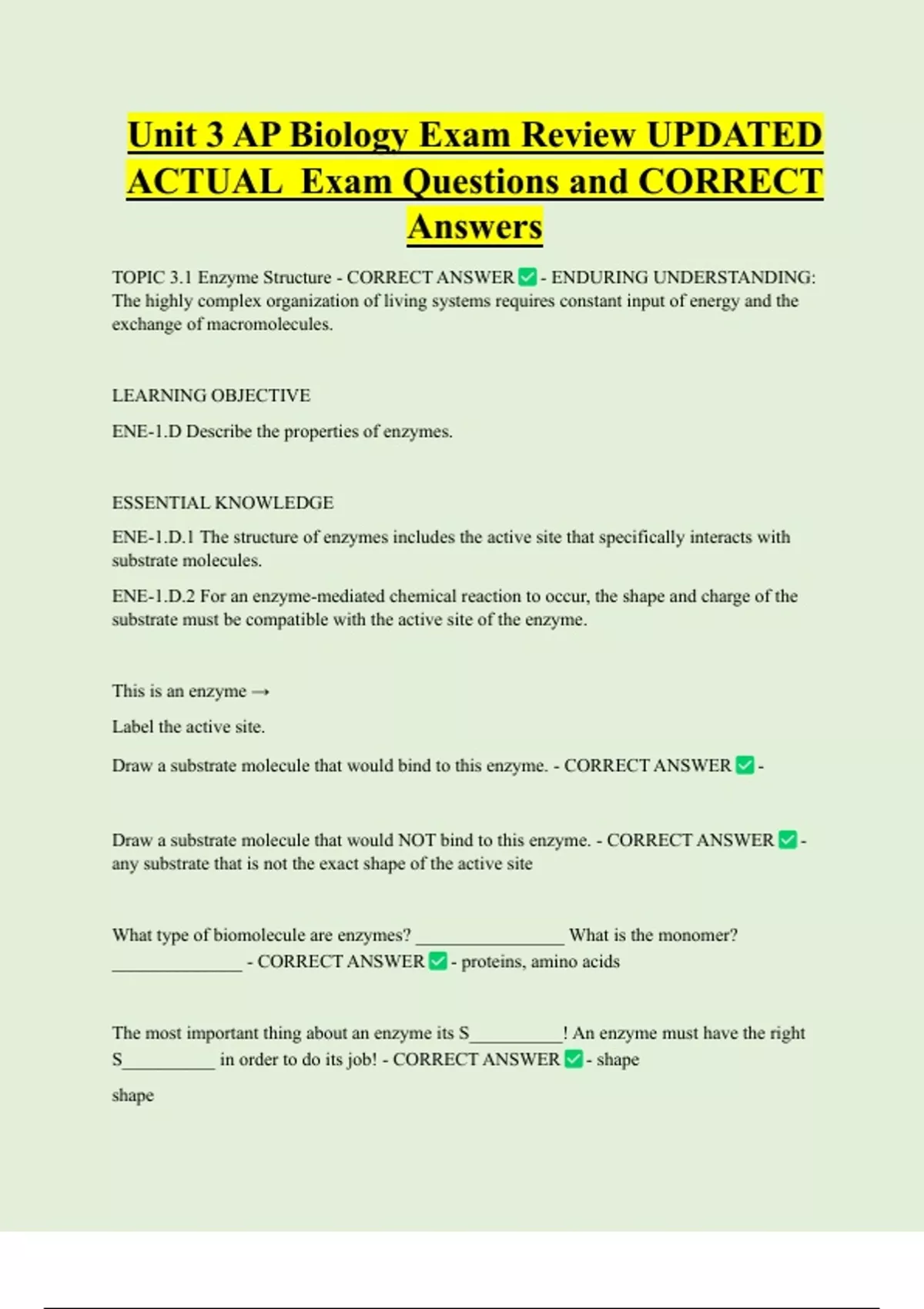 TOPIC 3.1 Enzyme Structure - CORRECT ANSWER - ENDURING UNDERSTANDING: