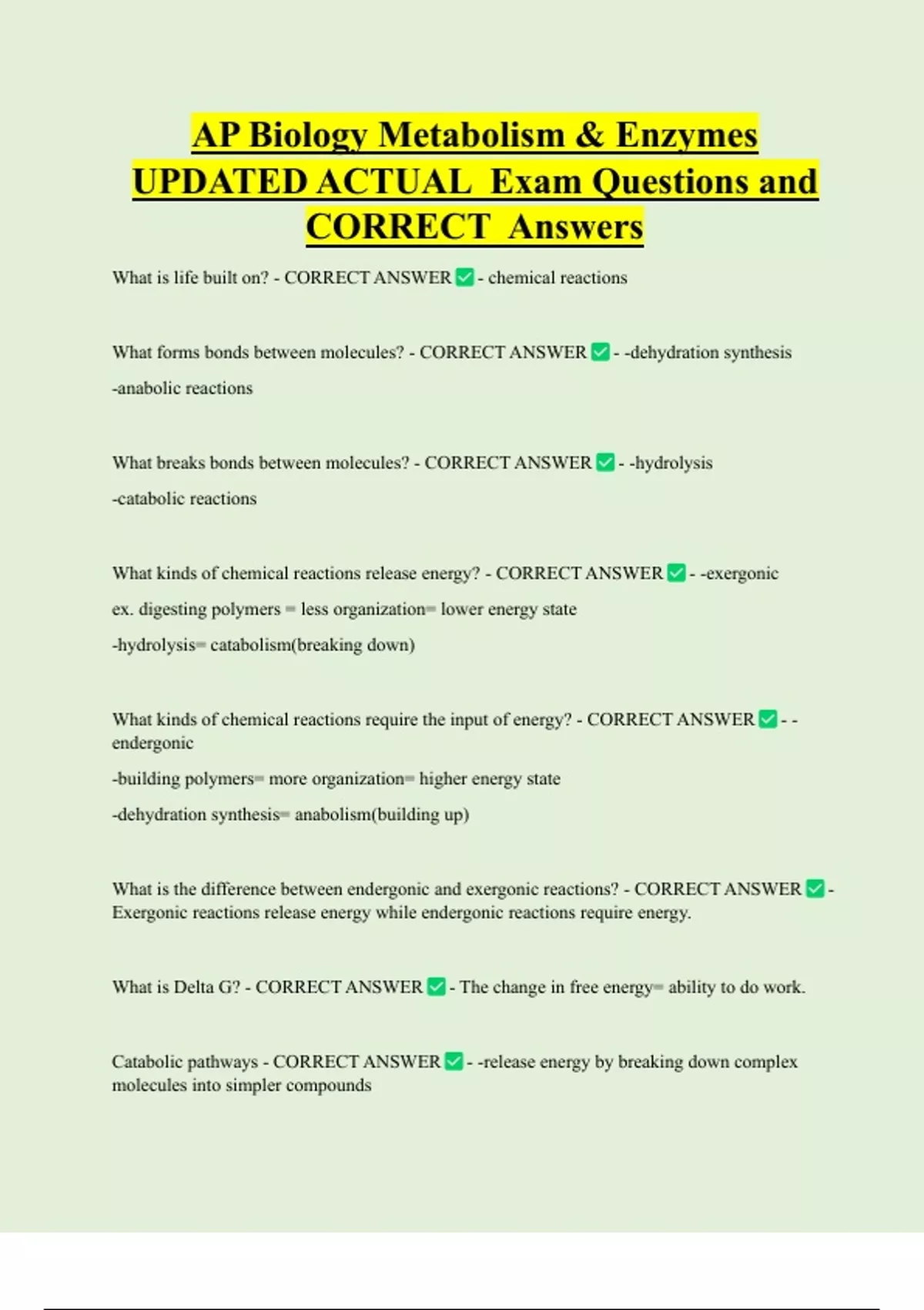 What kinds of chemical reactions release energy? - CORRECT ANSWER - -exergonic