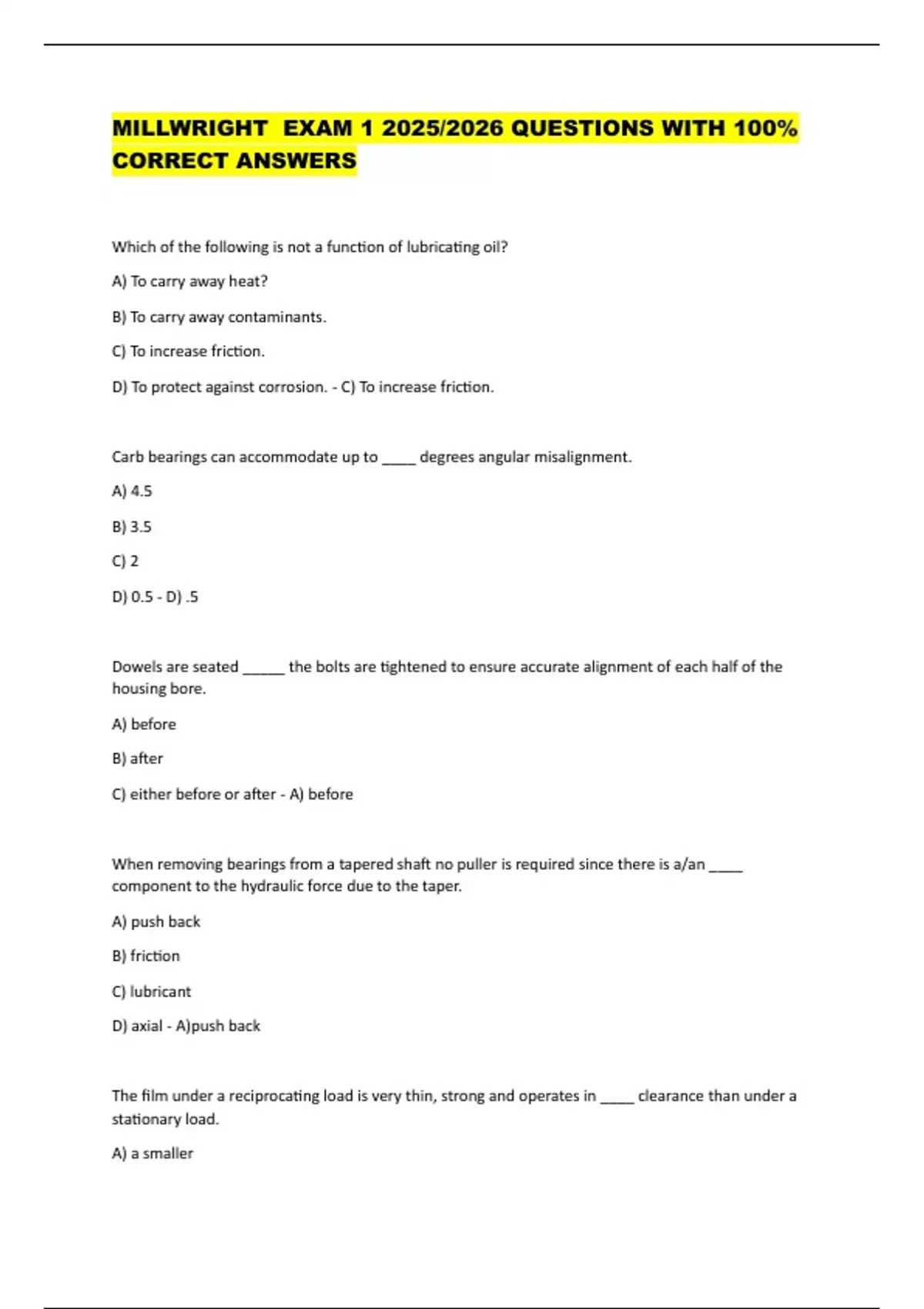 MILLWRIGHT EXAM 1 2025/2026 QUESTIONS WITH 100% CORRECT ANSWERS Which of the following is not a function of lubricating oil? A) To carry away heat? B) To carry away contaminants. C) To increase friction. D) To protect against corrosion. - C) To increase friction. Carb bearings can accommodate up to ____ degrees angular misalignment. A) 4.5 B) 3.5 C) 2 D) 0.5 - D) .5 Dowels are seated _____ the bolts are tightened to ensure accurate alignment of each half of the housing bore. A) before B) after C) either before or after - A) before When removing bearings from a tapered shaft no puller is required since there is a/an ____ component to the hydraulic force due to the taper.