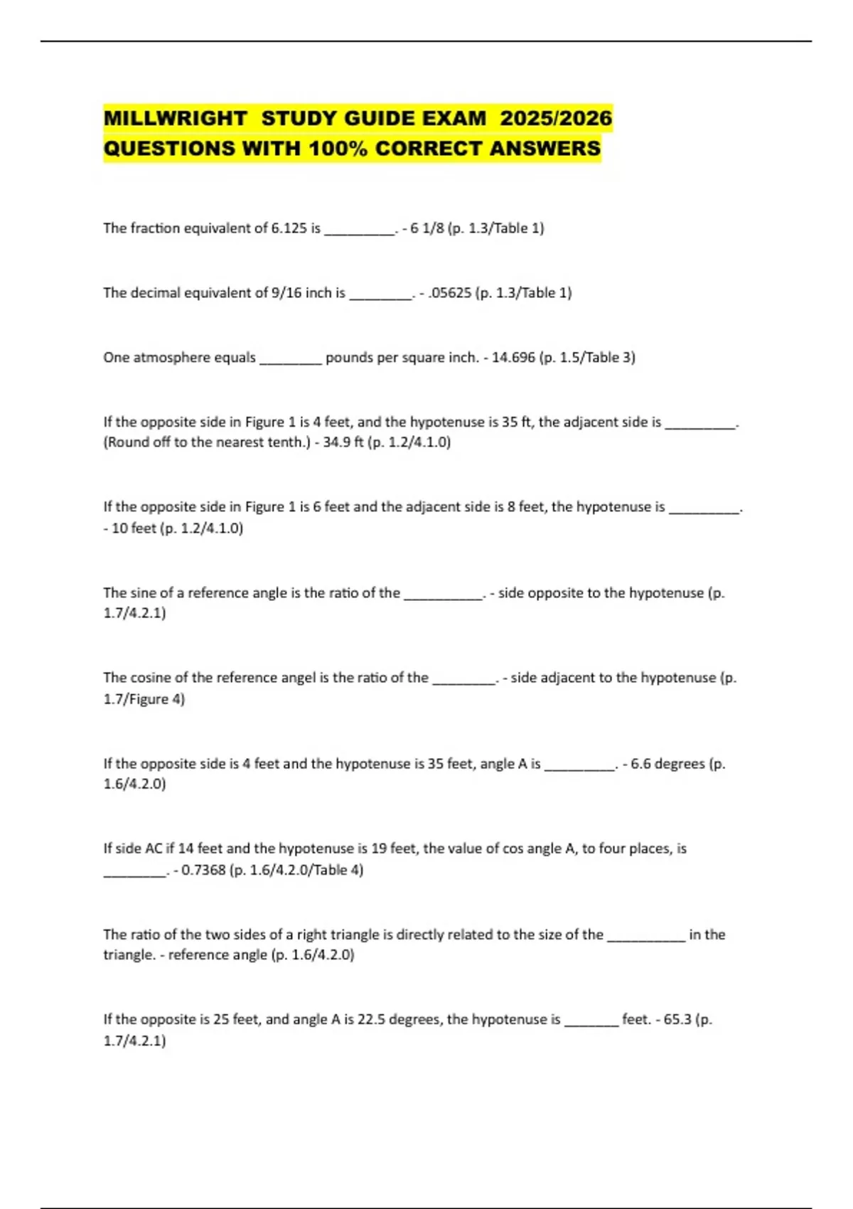 MILLWRIGHT STUDY GUIDE EXAM 2025/2026 QUESTIONS WITH 100% CORRECT ANSWERS The fraction equivalent of 6.125 is _________. - 6 1/8 (p. 1.3/Table 1) The decimal equivalent of 9/16 inch is ________. - .05625 (p. 1.3/Table 1) One atmosphere equals ________ pounds per square inch. - 14.696 (p. 1.5/Table 3) If the opposite side in Figure 1 is 4 feet, and the hypotenuse is 35 ft, the adjacent side is _________. (Round off to the nearest tenth.) - 34.9 ft (p. 1.2/4.1.0) If the opposite side in Figure 1 is 6 feet and the adjacent side is 8 feet, the hypotenuse is _________. - 10 feet (p. 1.2/4.1.0) The sine of a reference angle is the ratio of the __________. - side opposite to the hypotenuse (p. 1.7/4.2.1) The cosine of the reference angel is the ratio of the ________. - side adjacent to the hypotenuse (p. 1.7/Figure 4) If the opposite side is 4 feet and the hypotenuse is 35 feet, angle A is _________. - 6.6 degrees (p. 1.6/4.2.0) If side AC if 14 feet and the hypotenuse is 19 feet, the value of cos angle A, to four places, is ________. - 0.7368 (p. 1.6/4.2.0/Table 4)