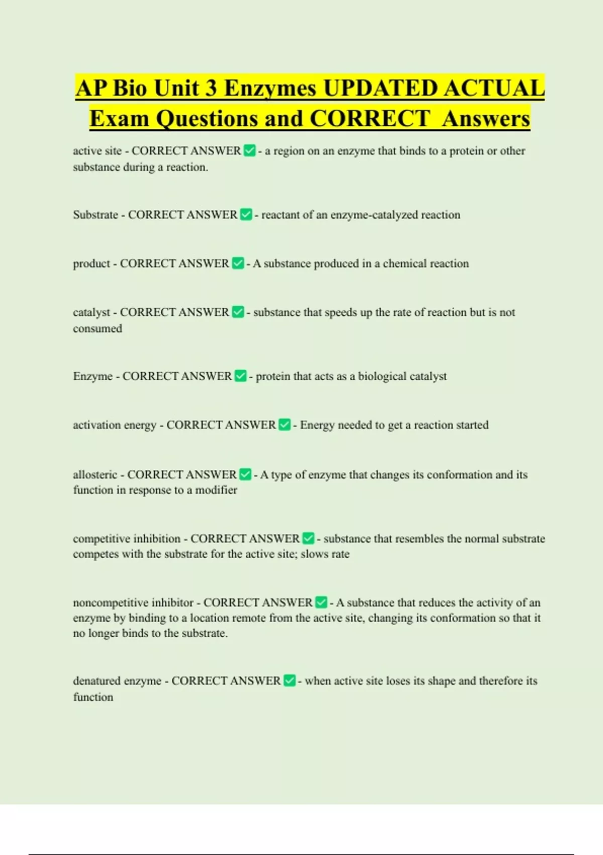 Enzyme - CORRECT ANSWER - protein that acts as a biological catalyst