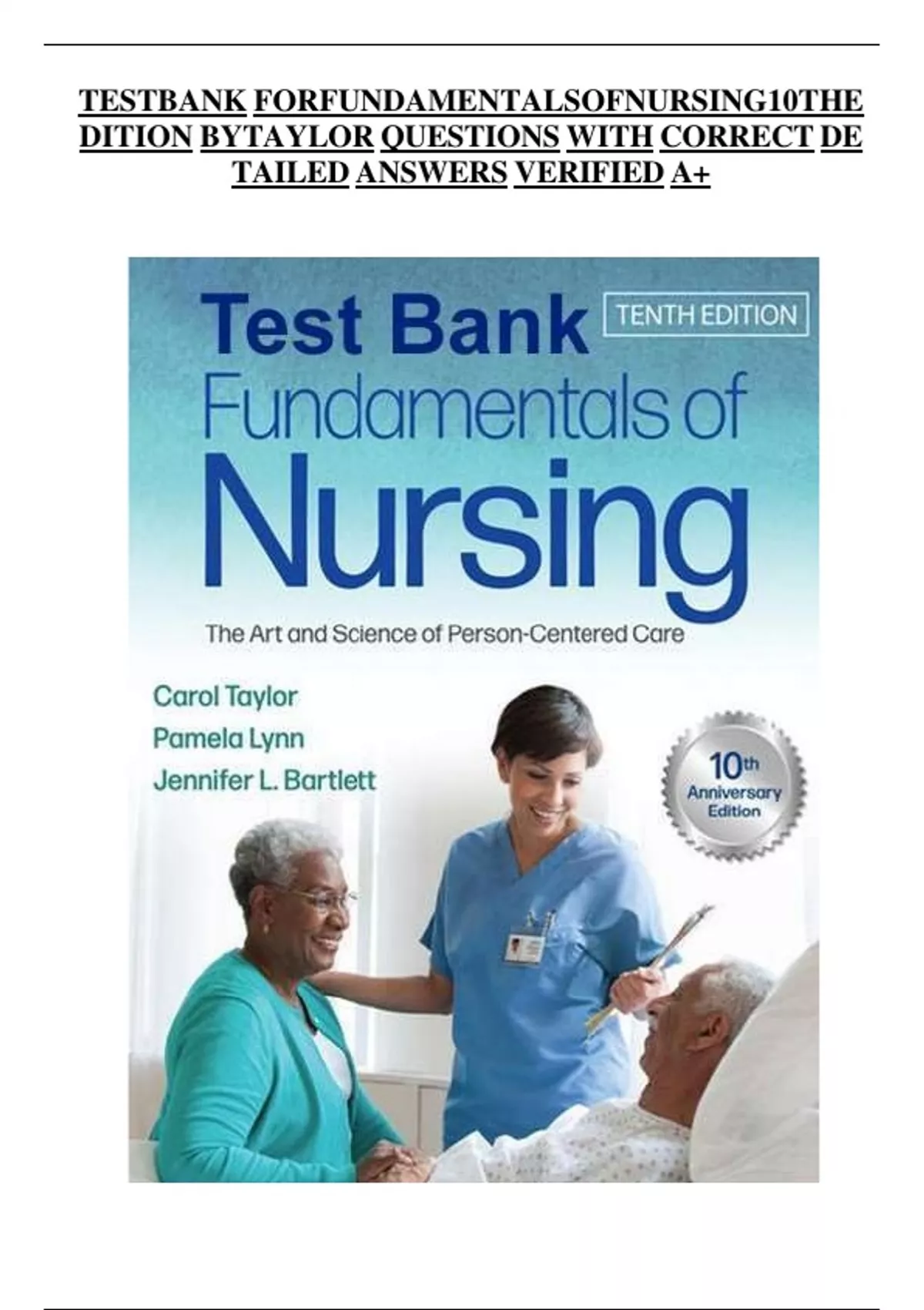 TEST BANK FOR FUNDAMENTALSOF NURSING 10TH EDITION BY TAYLOR QUESTIONS WITH CORRECT DETAILED ANSWERS VERIFIED A+