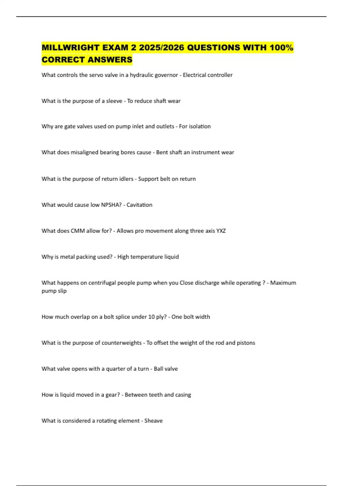 MILLWRIGHT EXAM 2 2025/2026 QUESTIONS WITH 100% CORRECT ANSWERS What controls the servo valve in a hydraulic governor - Electrical controller What is the purpose of a sleeve - To reduce shaft wear Why are gate valves used on pump inlet and outlets - For isolation What does misaligned bearing bores cause - Bent shaft an instrument wear What is the purpose of return idlers - Support belt on return What would cause low NPSHA? - Cavitation What does CMM allow for? - Allows pro movement along three axis YXZ Why is metal packing used? - High temperature liquid What happens on centrifugal people pump when you Close discharge while operating ? - Maximum pump slip How much overlap on a bolt splice under 10 ply? - One bolt width What is the purpose of counterweights - To offset the weight of the rod and pistons