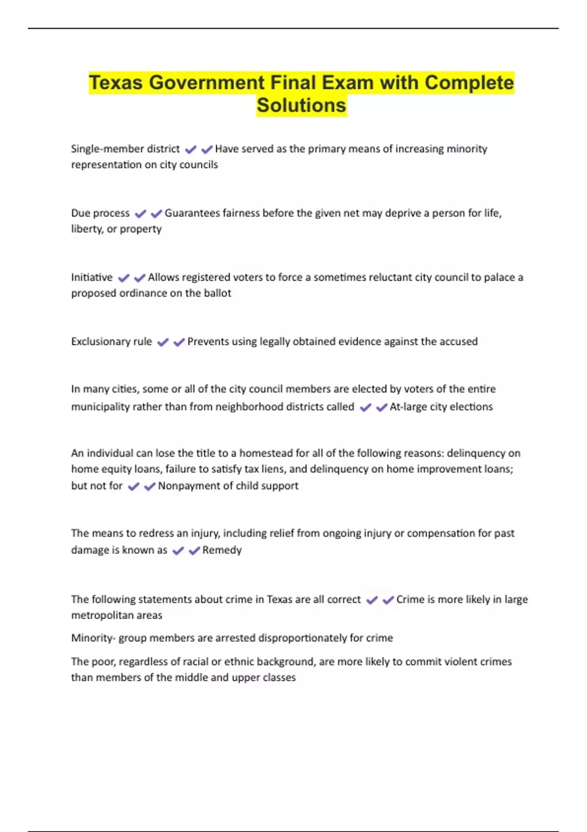Texas Government Final Exam with Complete