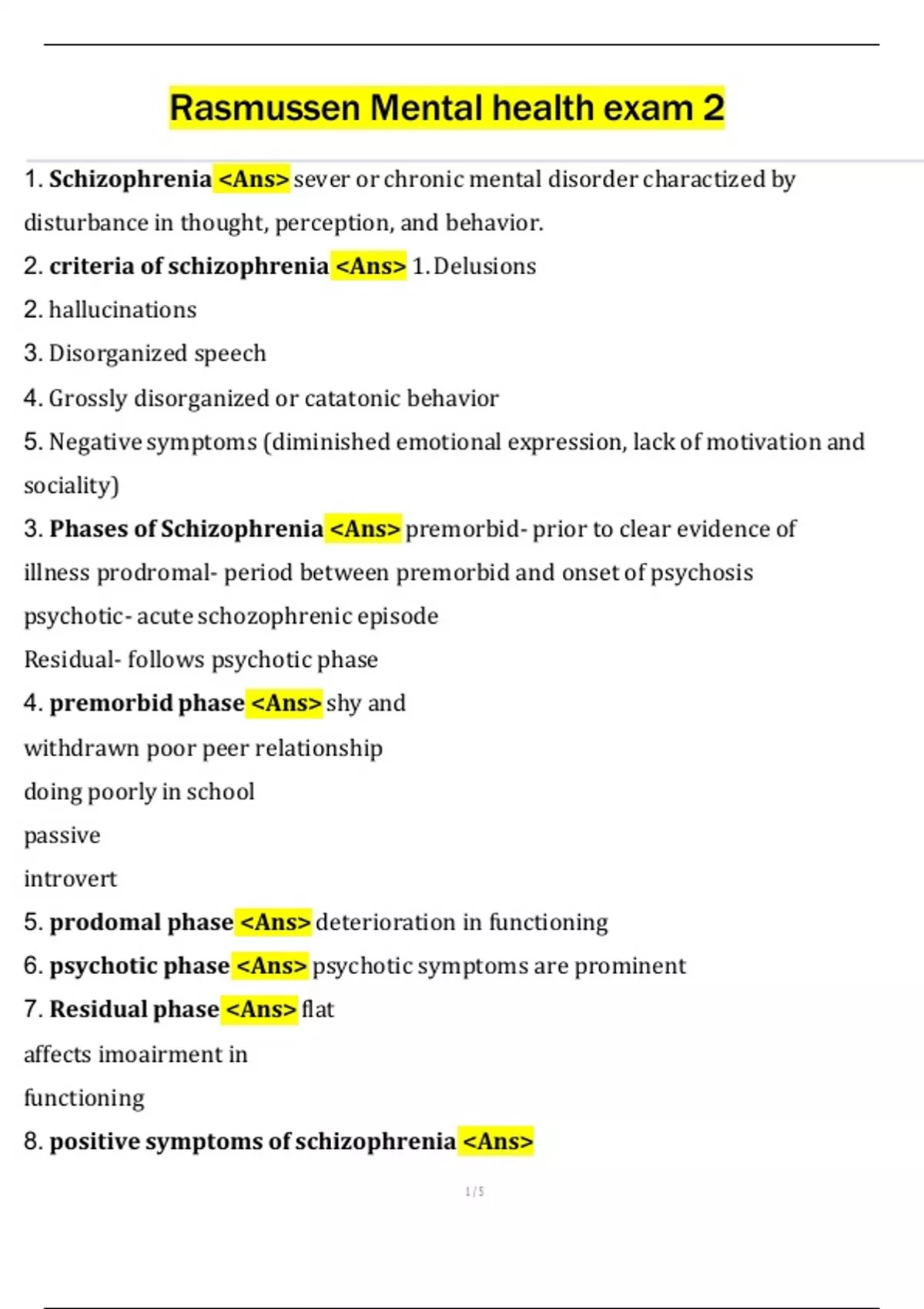 1. Schizophrenia <Ans> sever or chronic mental disorder charactized by