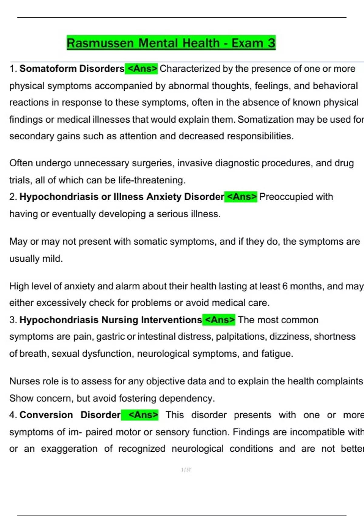 1. Somatoform Disorders <Ans> Characterized by the presence of one or more