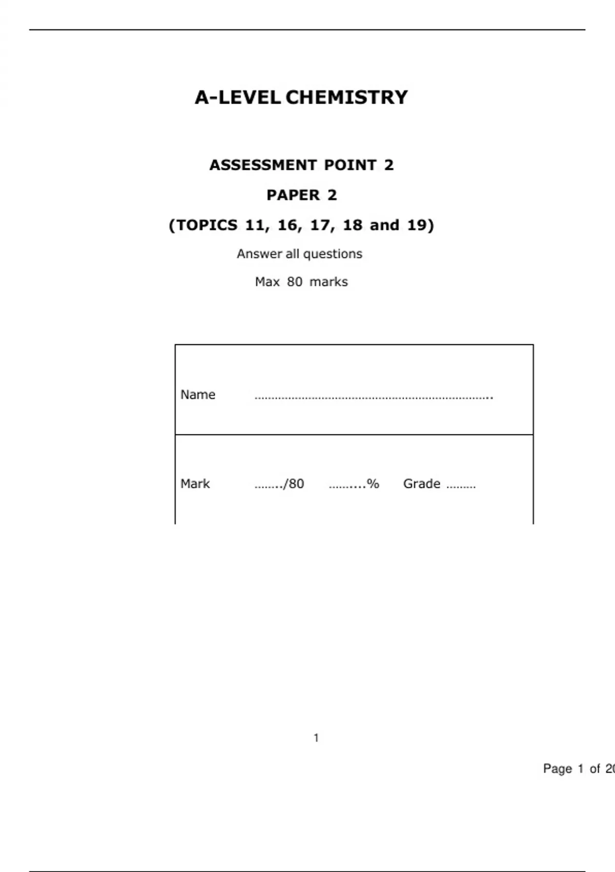 A-LEVEL CHEMISTRY ASSESSMENT POINT 2 PAPER 2 (TOPICS 11, 16, 17, 18 and 19) Answer all questions