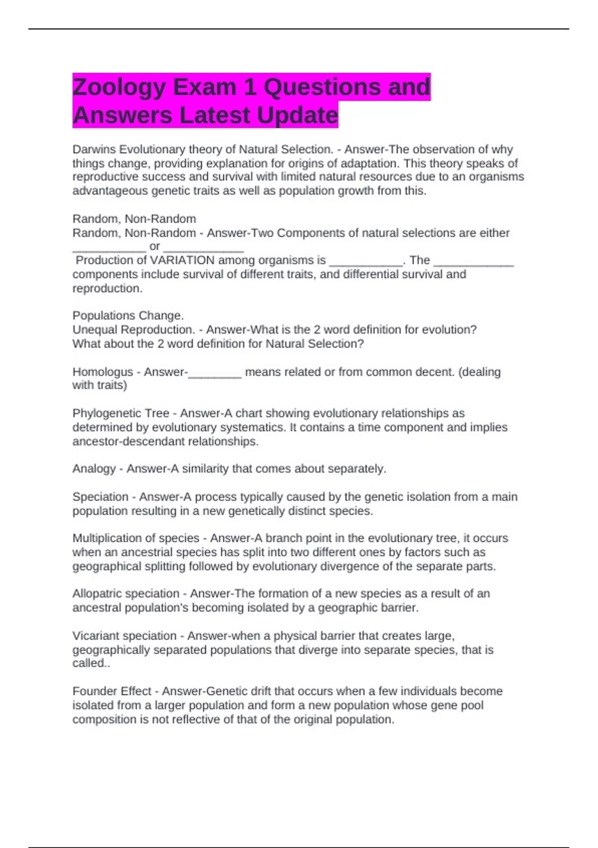 Zoology Exam 1 Questions and Answers Latest Update