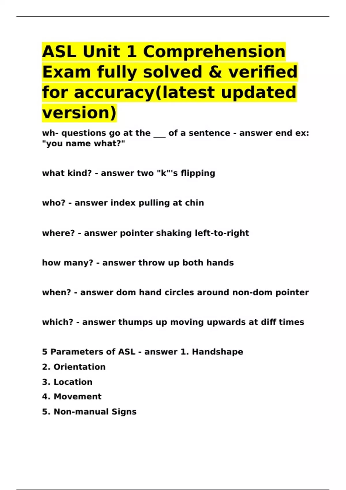 5 Parameters of ASL - answer 1. Handshape