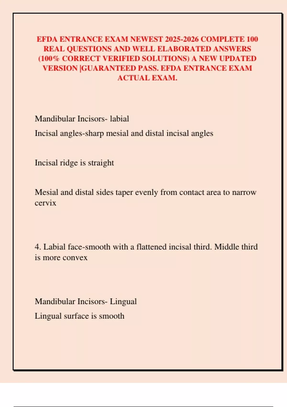 EFDA ENTRANCE EXAM NEWEST COMPLETE 100 REAL QUESTIONS AND WELL ELABORATED ANSWERS (100% CORRECT VERIFIED SOLUTIONS) A NEW UPDATED VERSION |GUARANTEED PASS. EFDA ENTRANCE EXAM ACTUAL EXAM.