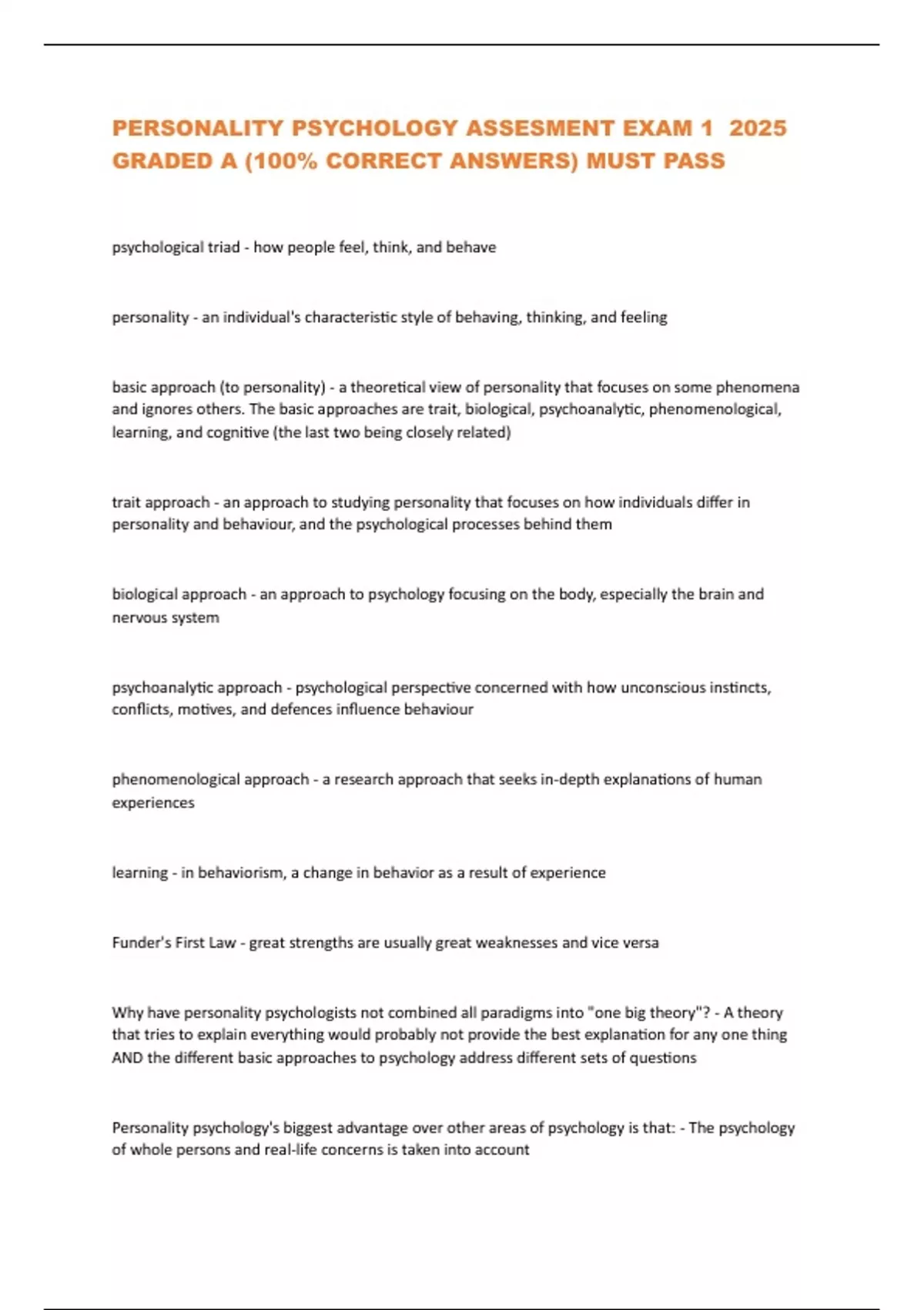 PERSONALITY PSYCHOLOGY ASSESMENT EXAM 1 2025 GRADED A (100% CORRECT ANSWERS) MUST PASS psychological triad - how people feel, think, and behave personality - an individual's characteristic style of behaving, thinking, and feeling basic approach (to personality) - a theoretical view of personality that focuses on some phenomena and ignores others. The basic approaches are trait, biological, psychoanalytic, phenomenological, learning, and cognitive (the last two being closely related) trait approach - an approach to studying personality that focuses on how individuals differ in personality and behaviour, and the psychological processes behind them biological approach - an approach to psychology focusing on the body, especially the brain and nervous system psychoanalytic approach - psychological perspective concerned with how unconscious instincts, conflicts, motives, and defences influence behaviour phenomenological approach - a research approach that seeks in-depth explanations of human experiences learning - in behaviorism, a change in behavior as a result of experience Funder's First Law - great strengths are usually great weaknesses and vice versa