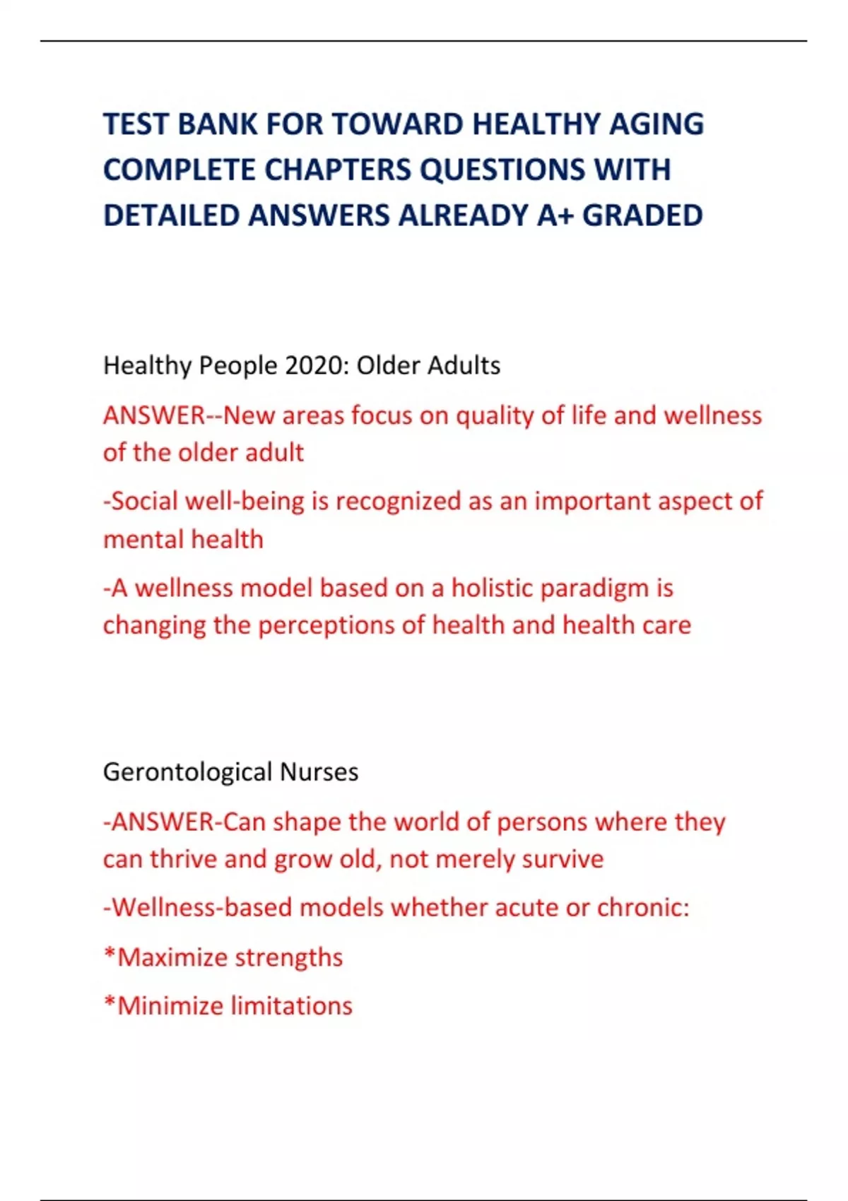 TEST BANK FOR TOWARD HEALTHY AGING