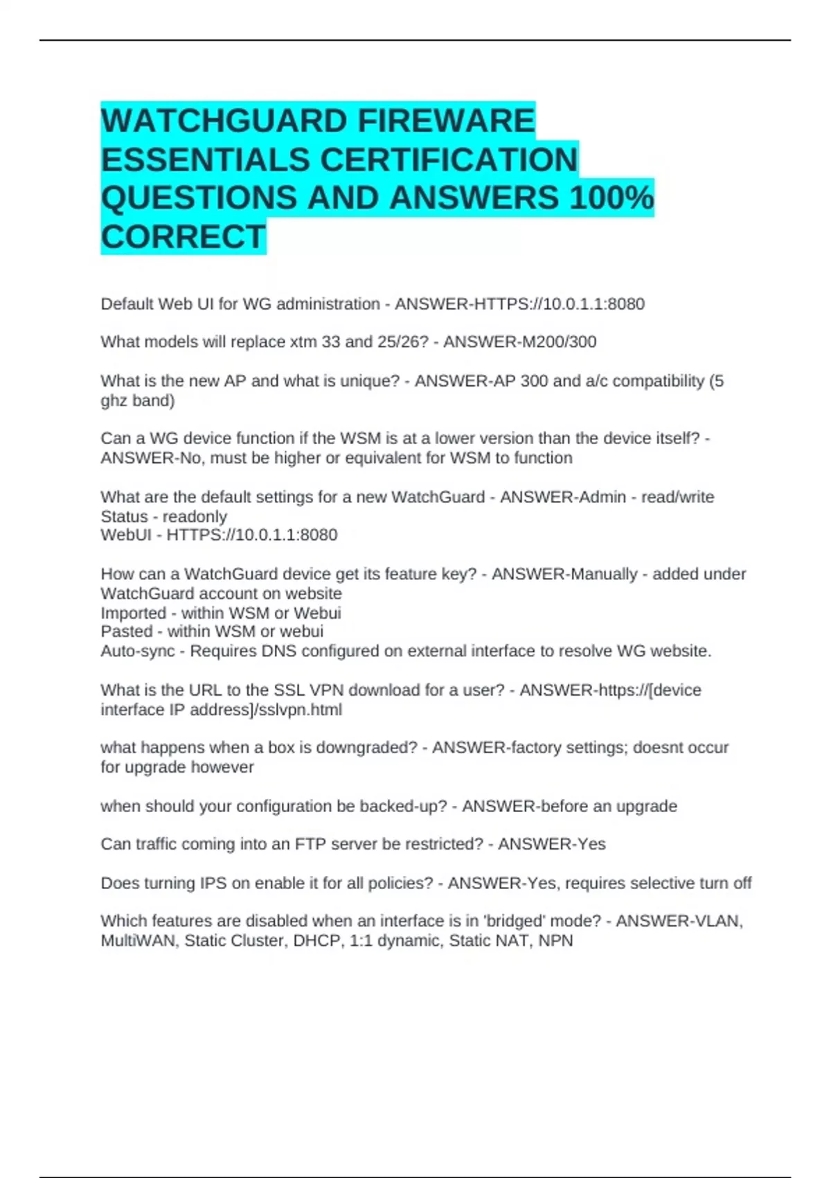WATCHGUARD FIREWARE ESSENTIALS CERTIFICATION QUESTIONS AND ANSWERS 100% CORRECTWATCHGUARD FIREWARE ESSENTIALS CERTIFICATION QUESTIONS AND ANSWERS 100% CORRECTWATCHGUARD FIREWARE ESSENTIALS CERTIFICATION QUESTIONS AND ANSWERS 100% CORRECT