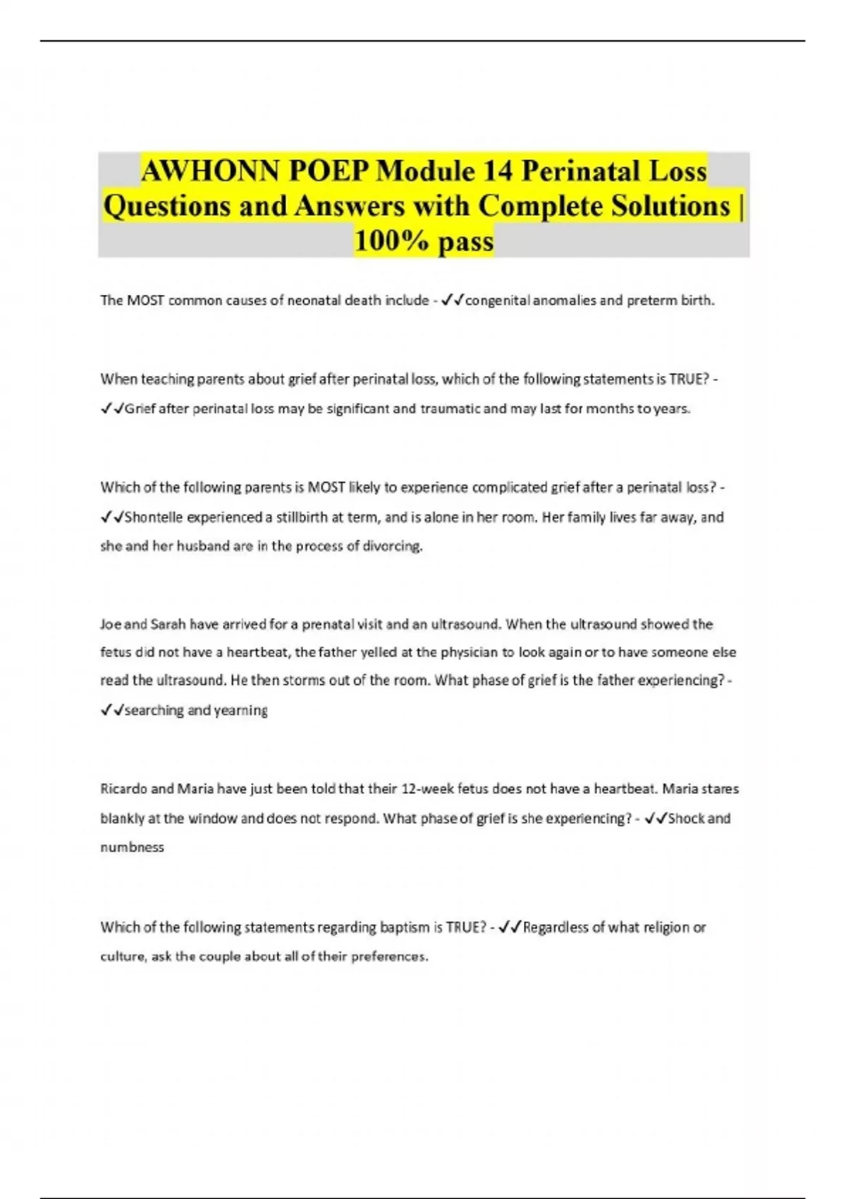 AWHONN POEP Module 14 Perinatal Loss Questions and Answers with Complete Solutions | 100% pass