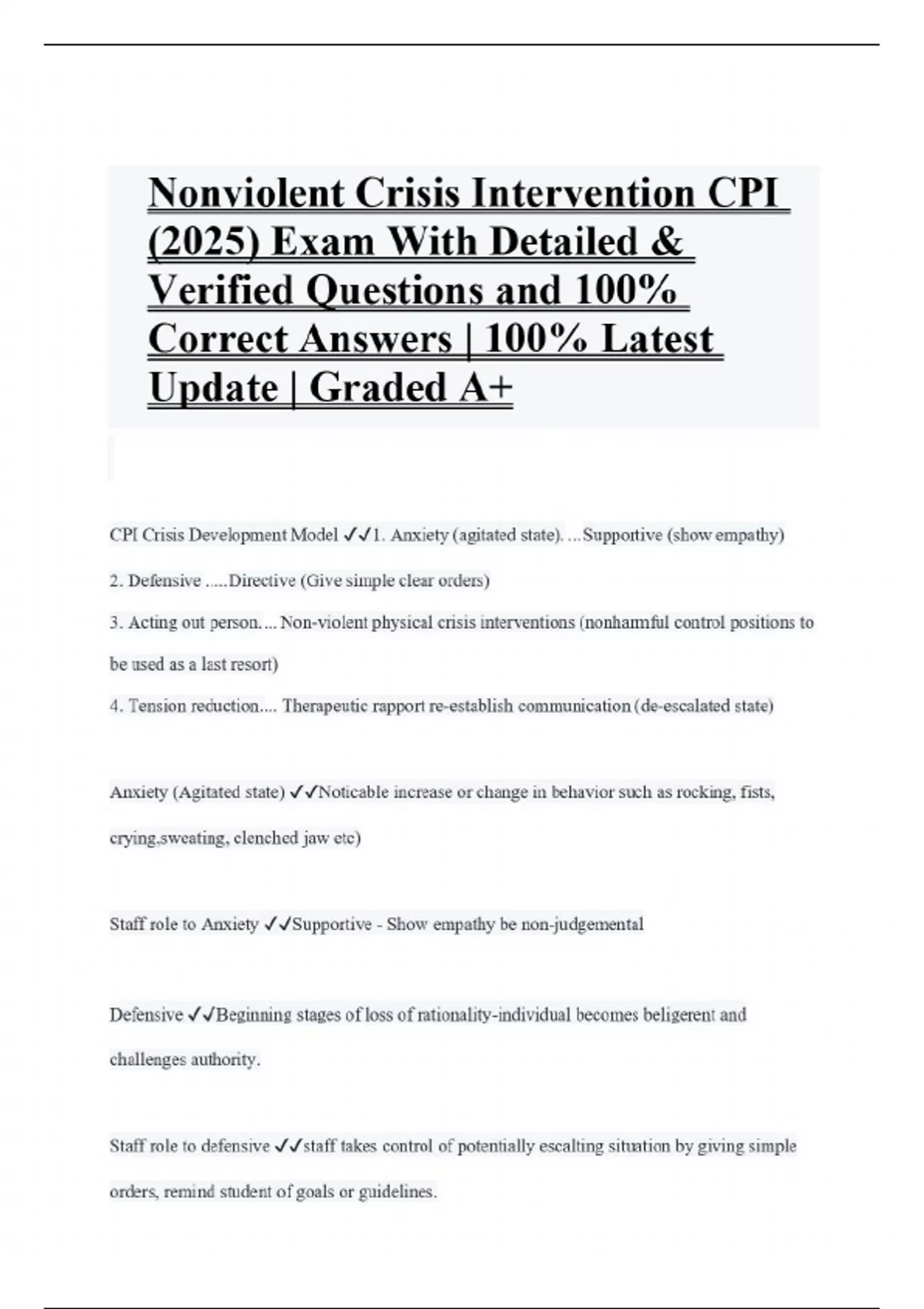 Nonviolent Crisis Intervention CPI (2025) Exam With Detailed & Verified Questions and 100% Correct Answers | 100% Latest Update | Graded A+