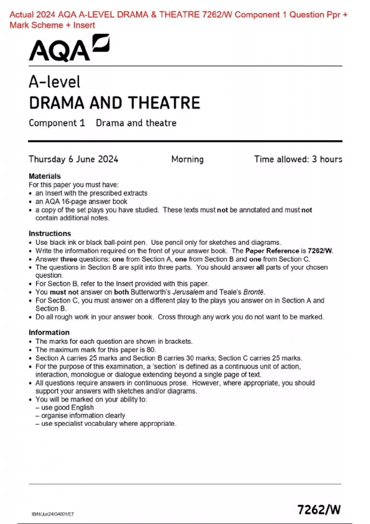 Actual 2024 AQA GCSE COMPUTER SCIENCE 8525/1C Paper 1 Computational thinking and programming skills Merged Question Paper + Mark Scheme