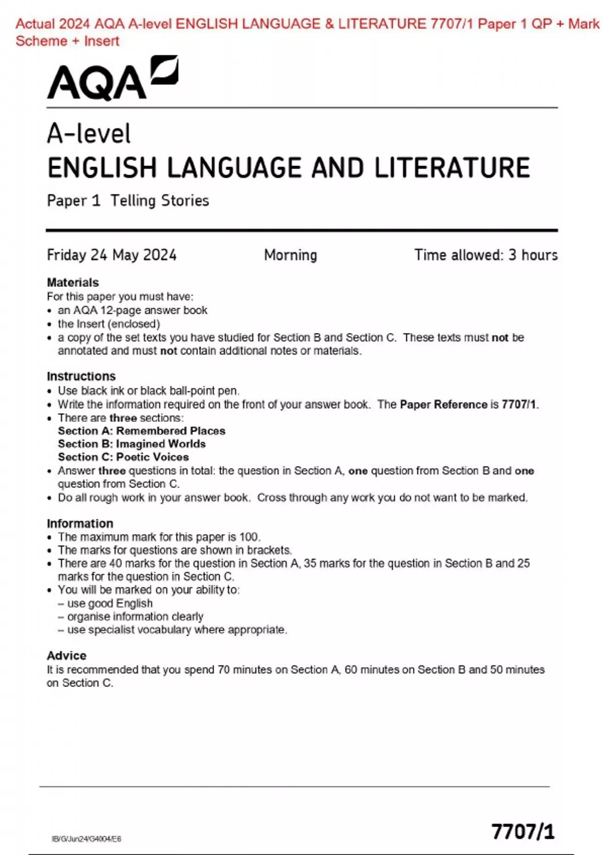 Actual 2024 AQA GCSE ENGLISH LITERATURE 8702/1 Paper 1 Shakespeare and the 19th-century novel Merged Question Paper + Mark Scheme
