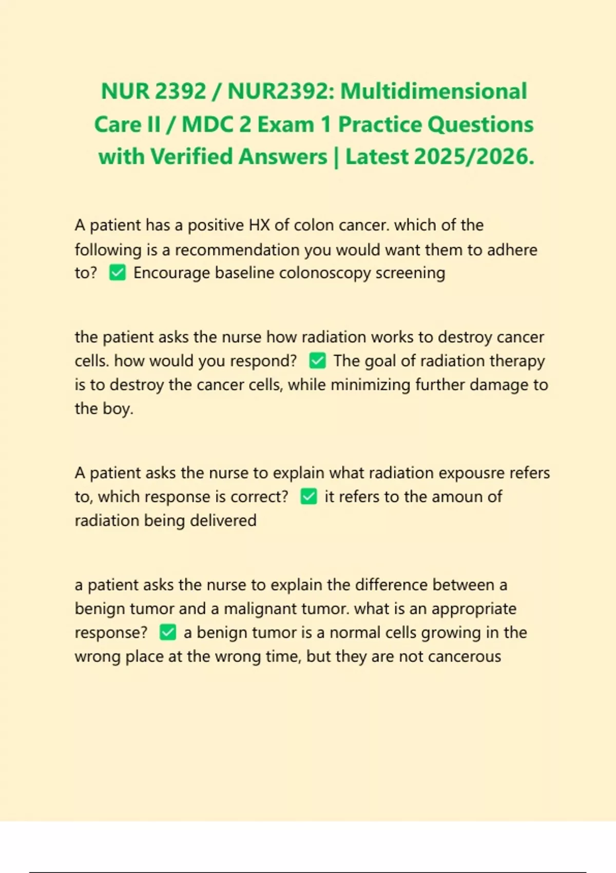 A patient has a positive HX of colon cancer. which of the following is a recommendation you would want them to adhere to? Encourage baseline colonoscopy screening the patient asks the nurse how radiation works to destroy cancer cells. how would you respond? The goal of radiation therapy is to destroy the cancer cells, while minimizing further damage to the boy. A patient asks the nurse to explain what radiation expousre refers to, which response is correct? it refers to the amoun of radiation being delivered a patient asks the nurse to explain the difference between a benign tumor and a malignant tumor. what is an appropriate response? a benign tumor is a normal cells growing in the wrong place at the wrong time, but they are not cancerous a patient is undergoing chemotherapy and is receiving education about the reduction of infection risk, which action reduces the risk of infection Hand hygeine A patient would like to know what it means that her breast cancer has metastasized? Cancer cells have moved from their primary site the patient who has undergone which procedure is at most risk for hypocalcemia thyroidectomy what serum laboratory value does the nurse expect to see with a patient who is hypokalemic potassium less than 3.5 the nurse uses which phrase to describe palliative care? patient care with focus on treatment of symptoms a nurse is caring for a 72-year-old female, she has a diagnosis of dehydration. Which of the following nursing diagnoses should NOT be included in their plan? Fluid volume overload NUR 2392 / NUR2392: Multidimensional Care II / MDC 2 Exam 1 Practice Questions with Verified Answers | Latest 2025/2026.
