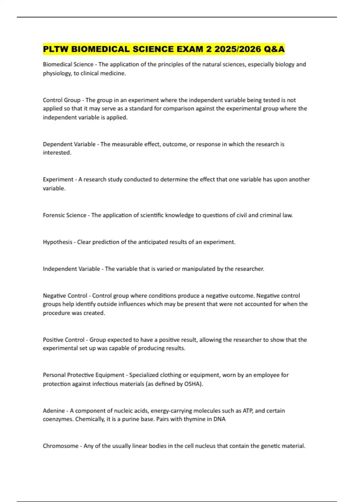 PLTW BIOMEDICAL SCIENCE EXAM 2 2025/2026 Q&A Biomedical Science - The application of the principles of the natural sciences, especially biology and physiology, to clinical medicine. Control Group - The group in an experiment where the independent variable being tested is not applied so that it may serve as a standard for comparison against the experimental group where the independent variable is applied. Dependent Variable - The measurable effect, outcome, or response in which the research is interested. Experiment - A research study conducted to determine the effect that one variable has upon another variable. Forensic Science - The application of scientific knowledge to questions of civil and criminal law. Hypothesis - Clear prediction of the anticipated results of an experiment. Independent Variable - The variable that is varied or manipulated by the researcher. Negative Control - Control group where conditions produce a negative outcome. Negative control groups help identify outside influences which may be present that were not accounted for when the procedure was created. Positive Control - Group expected to have a positive result, allowing the researcher to show that the experimental set up was capable of producing results. Personal Protective Equipment - Specialized clot