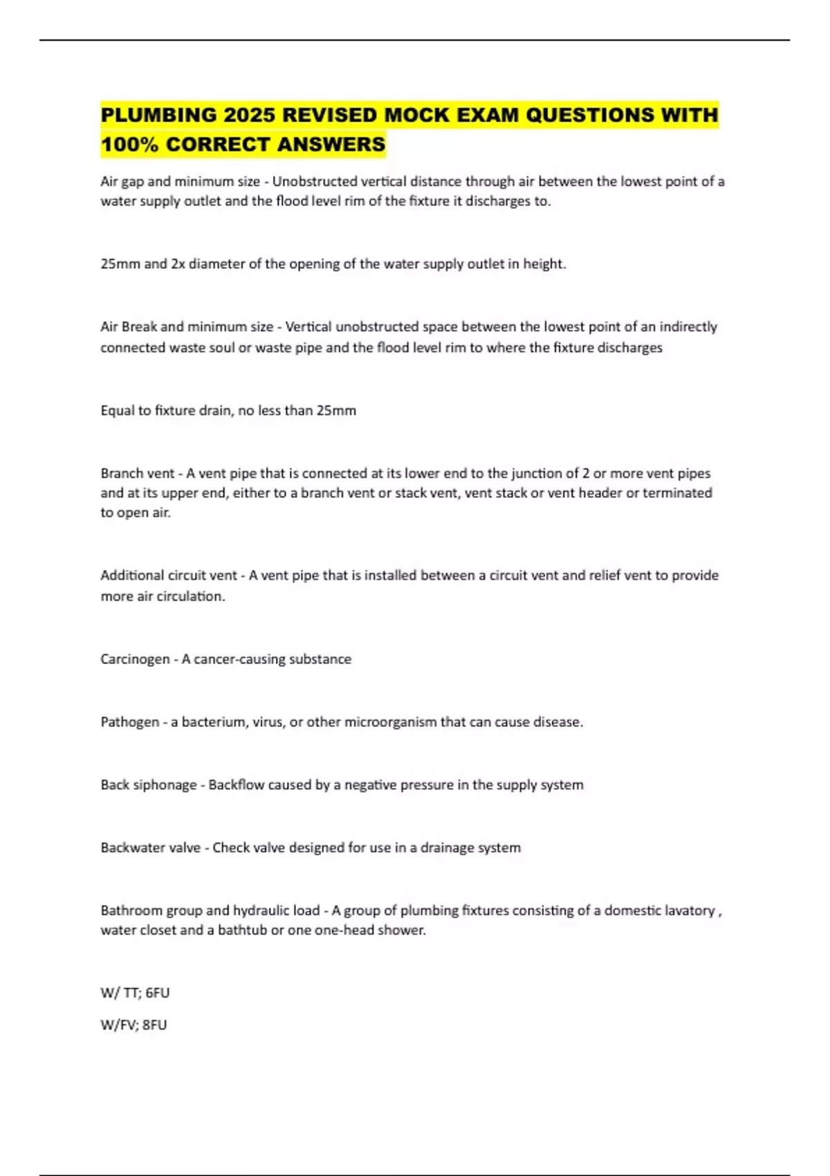 PLUMBING 2025 REVISED MOCK EXAM QUESTIONS WITH 100% CORRECT ANSWERS Air gap and minimum size - Unobstructed vertical distance through air between the lowest point of a water supply outlet and the flood level rim of the fixture it discharges to. 25mm and 2x diameter of the opening of the water supply outlet in height. Air Break and minimum size - Vertical unobstructed space between the lowest point of an indirectly connected waste soul or waste pipe and the flood level rim to where the fixture discharges Equal to fixture drain, no less than 25mm Branch vent - A vent pipe that is connected at its lower end to the junction of 2 or more vent pipes and at its upper end, either to a branch vent or stack vent, vent stack or vent header or terminated to open air. Additional circuit vent - A vent pipe that is installed between a circuit vent and relief vent to provide more air circulation. Carcinogen - A cancer-causing substance Pathogen - a bacterium, virus, or other microorganism that can cause disease. Back siphonage - Backflow caused by a negative pressure in the supply system Backwater valve - Check valve designed for use in a drainage system