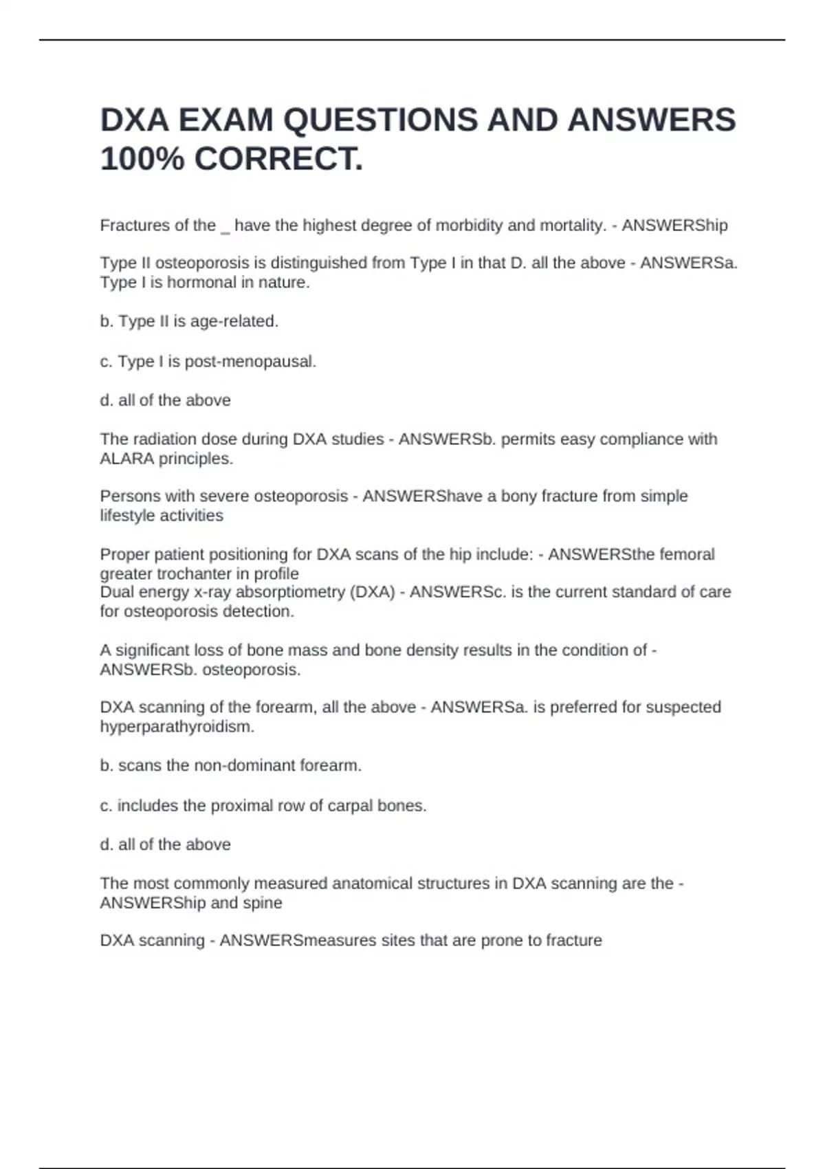 Dual energy x-ray absorptiometry (DXA) - ANSWERSc. is the current standard of care