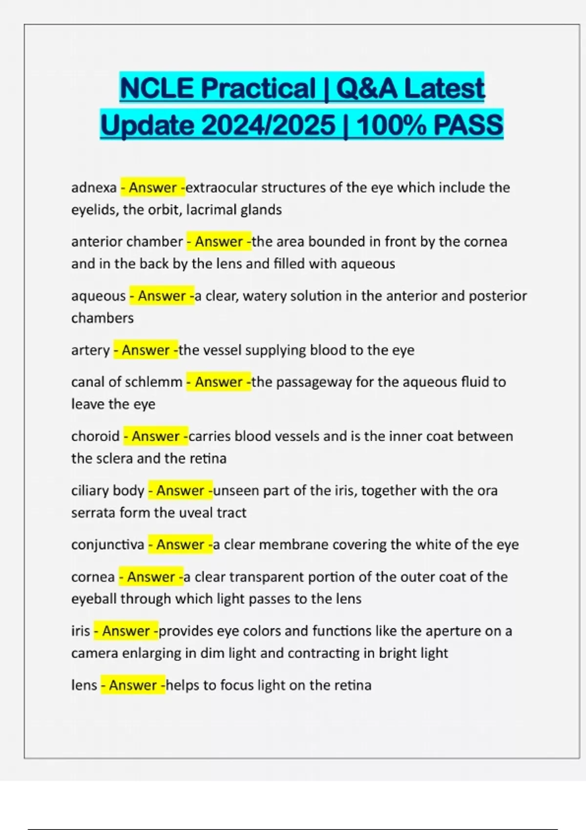 NCLE Practical | Q&A Latest Update 2024/2025 | 100% PASS adnexa - Answer -extraocular structures of the eye which include the eyelids, the orbit, lacrimal glands anterior chamber - Answer -the area bounded in front by the cornea and in the back by the lens and filled with aqueous aqueous - Answer -a clear, watery solution in the anterior and posterior chambers artery - Answer -the vessel supplying blood to the eye canal of schlemm - Answer -the passageway for the aqueous fluid to leave the eye choroid - Answer -carries blood vessels and is the inner coat between the sclera and the retina ciliary body - Answer -unseen part of the iris, together with the ora serrata form the uveal tract conjunctiva - Answer -a clear membrane covering the white of the eye cornea - Answer -a clear transparent po