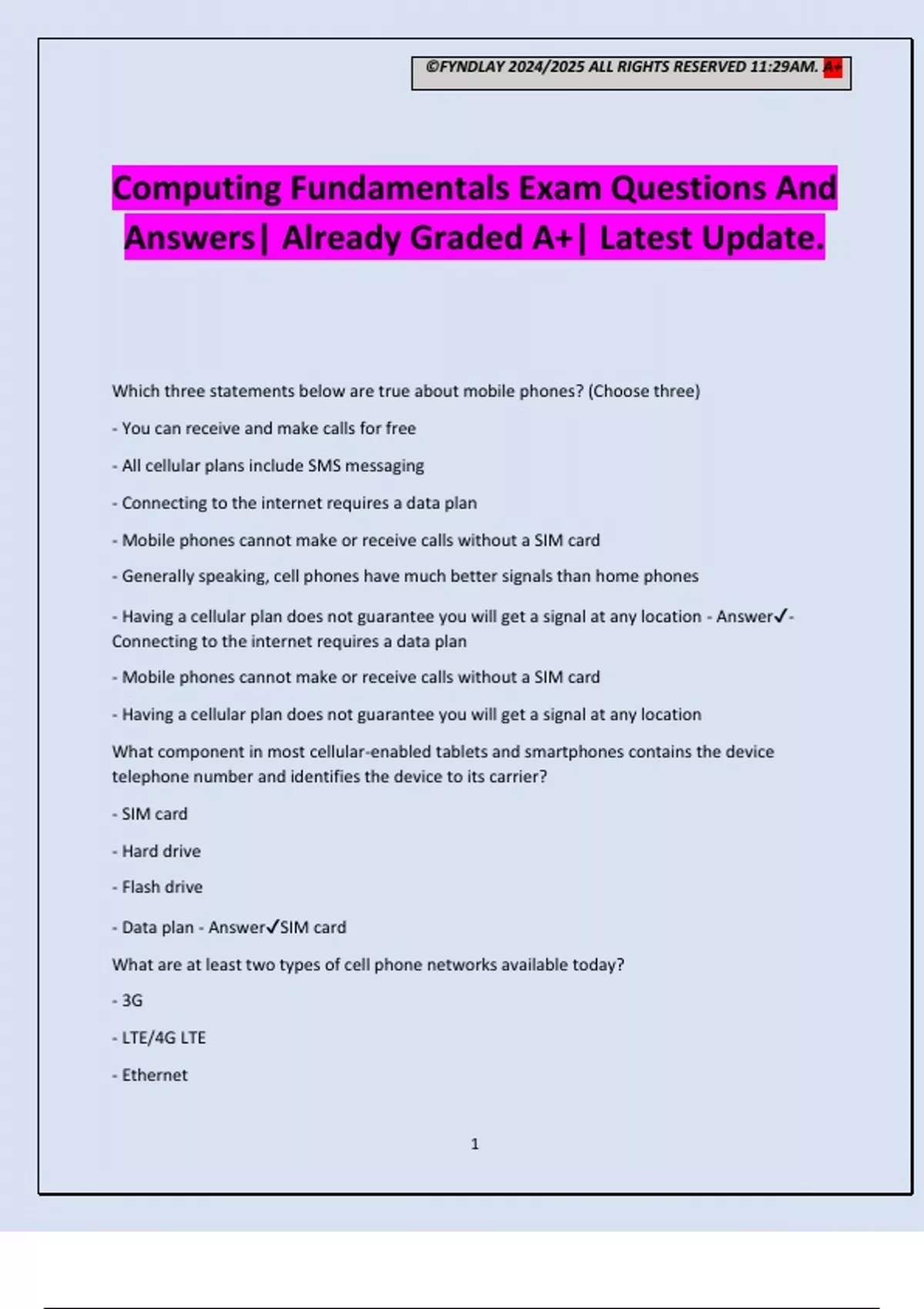©FYNDLAY 2024/2025 ALL RIGHTS RESERVED 11:29AM. A+ 1 Computing Fundamentals Exam Questions And Answers| Already Graded A+| Latest Update. Which three statements below are true about mobile phones? (Choose three) - You can receive and make calls for free - All cellular plans include SMS messaging - Connecting to the internet requires a data plan - Mobile phones cannot make or receive calls without a SIM card - Generally speaking, cell phones have much better signals than home phones - Having a cellular plan does not guarantee you will get a signal at any location - Answer- Connecting to the internet requires a data plan - Mobile phones cannot make or receive calls without a SIM card - Having a cellular plan does not guarantee you will get a signal at any location What component in most cellular-enabled tablets and smartphones contains the device telephone number and identifies the device to its carrier? - SIM card - Hard drive - Flash drive - Data plan - AnswerSIM card What are at least two types of cell phone networks available today? - 3G - LTE/4G LTE - Ethernet ©FYNDLAY 2024/2025 ALL RIGHTS RESERVED 11:29AM. A+ 2 - USB - Answer- 3G - LTE/4G LTE Which of the following networks will allow you to connect your cellular-enabled tablet without incurring additional data costs? - Roaming network - Public wireless network - Local carrier network - Answer- Public wireless network What is a limitation of a tablet compared to a laptop computer? - Cannot make video calls - No email access - Some applications will not install on a tablet - Cannot edit documents - Answer- Some applications will not install on a tablet Which two of the following businesses would benefit most from using Wi-Fi only tablets rather than spending the extra money for cellular-enabled tablets? (Choose two) - Small restaurant - Carpet cleaning business - Clothing store - Flower delivery service - Real Estate agent - Answer- Small restaurant - Clothing store You are thinking about upgrading to a new cell phone and selling your old one. What are two things you should consider before selling your cell phone? (Choose two) - Remove the SIM card if applicable - Don't delete anything on the memory card if there is one - Leave all of your personal information on the device - Perform a factory reset on the device - Answer- Remove the SIM card if applicable - Perform a factory reset on the device ©FYNDLAY 2024/2025 ALL RIGHTS RESERVED 11:29AM. A+ 3 Which three activities could you avoid on a cellular-enabled tablet in order to prevent using too much data? (Choose three) - Edit a PowerPoint slide presentation - Watch streaming movies - Upload several lengthy HD videos - Listen to a local copy of an audiobook - Stay logged into Facebook even when not using it - Answer- Watch streaming movies - Upload several lengthy HD videos - Stay logged into Facebook even when not using it You want to browse the internet, but first, you have to connect to a network. A smartphone can connect to the Internet using which three methods? (Choose Three) - Wi-Fi - Mobile app - Mobile Hotspot - Data plan from a cellular carrier - Answer- Wi-Fi - Mobile Hotspot - Data plan from a cellular carrier You are buying a new cell phone but are comparing some models to see what will work best for you. What are two things you can do with a smartphone that you cannot do with a basic cellular phone? (Choose two) - Access voice mail - Browse the Internet similar to a computer - Send/Receive text messages - Edit a document - Answer- Browse the Internet similar to a computer - Edit a document You want to make a telephone call from a hard-wired phone at a business location. What is the most common number you must
