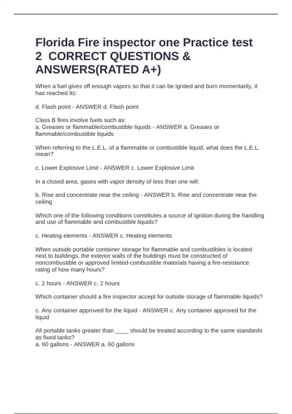 Florida Fire inspector one Practice test 2 CORRECT QUESTIONS & ANSWERS(RATED A+)