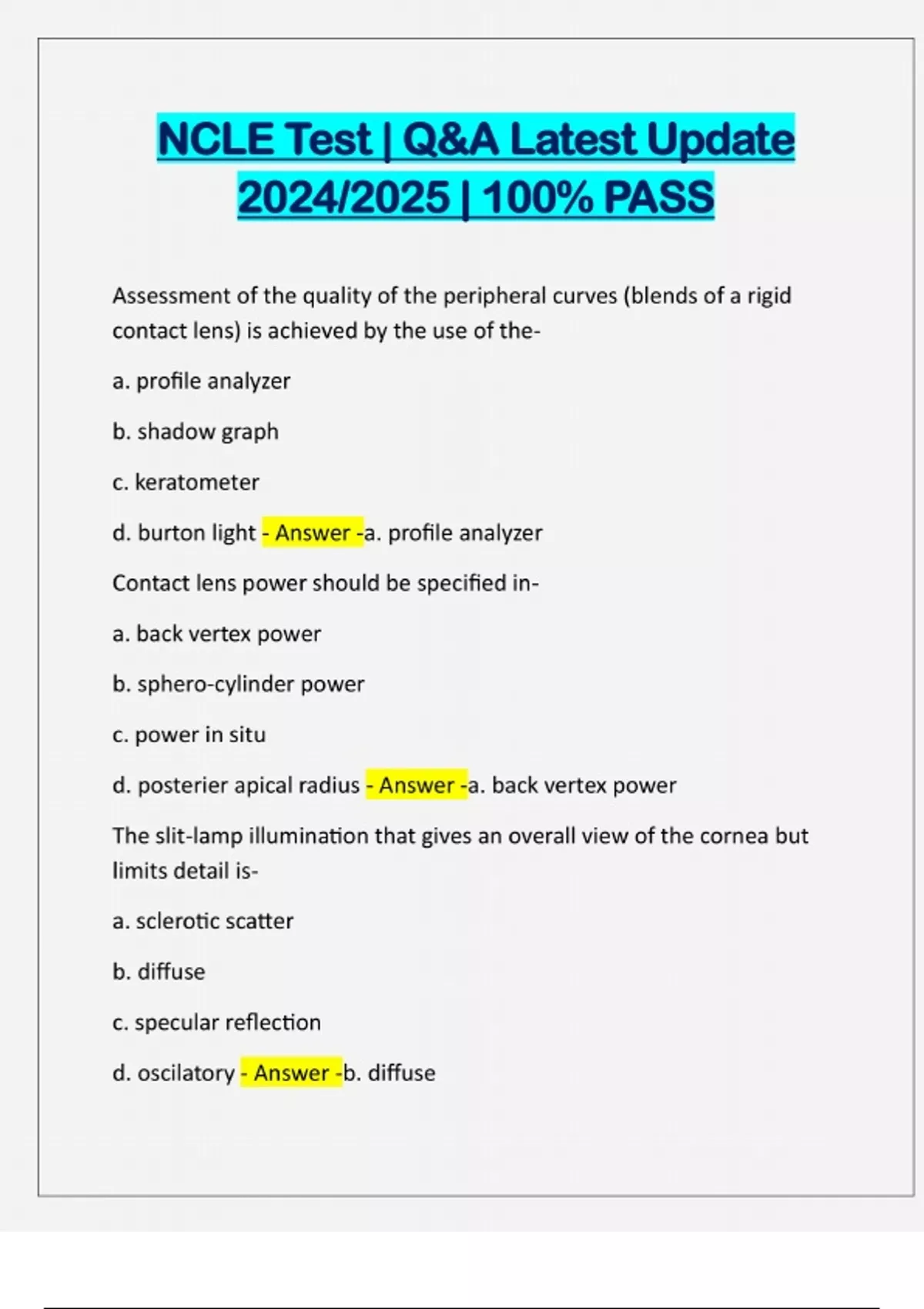NCLE Test | Q&A Latest Update 2024/2025 | 100% PASS Assessment of the quality of the peripheral curves (blends of a rigid contact lens) is achieved by the use of thea. profile analyzer b. shadow graph c. keratometer d. burton light - Answer -a. profile analyzer Contact lens power should be specified ina. back vertex power b. sphero-cylinder power c. power in situ d. posterier apical radius - Answer -a. back vertex power The slit-lamp illumination that gives an overall view of the cornea but limits detail isa. sclerotic scatter b. diffuse c. specular reflection