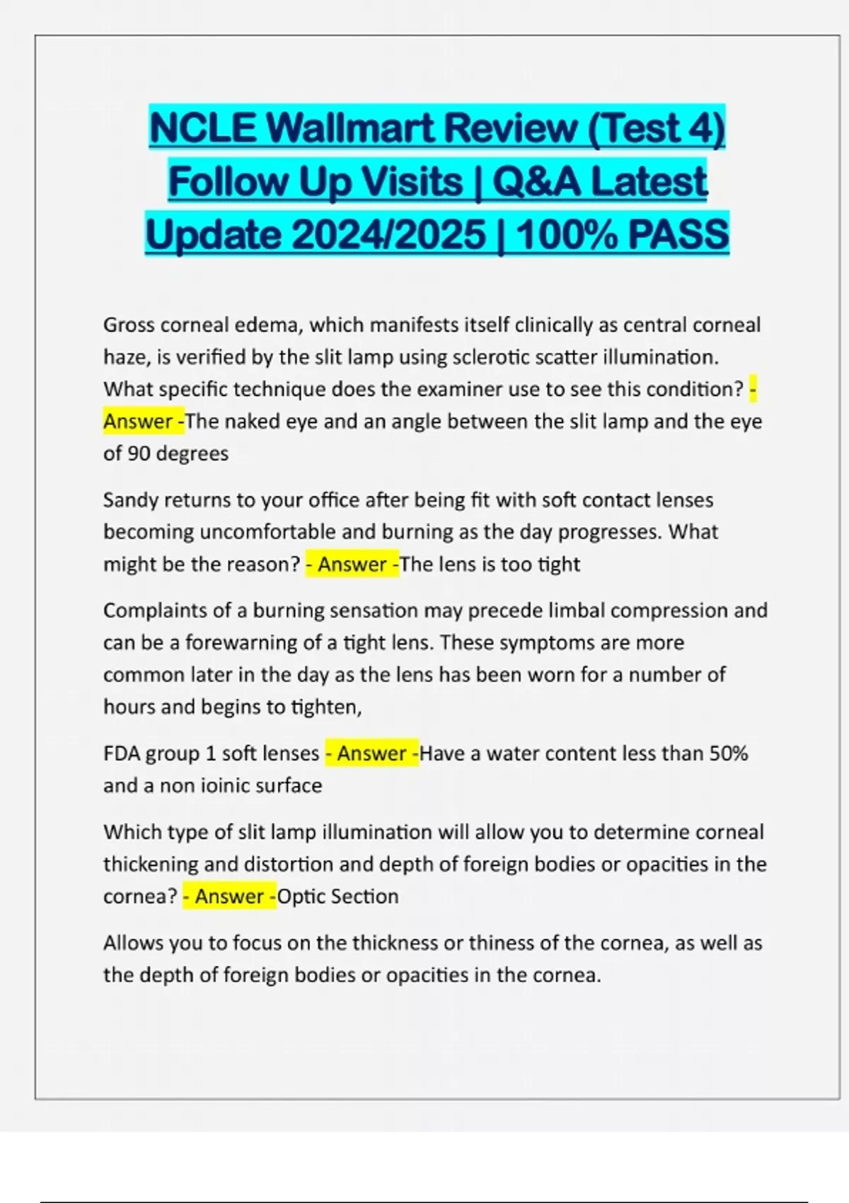 NCLE Wallmart Review (Test 4) Follow Up Visits | Q&A Latest Update 2024/2025 | 100% PASS Gross corneal edema, which manifests itself clinically as central corneal haze, is verified by the slit lamp using sclerotic scatter illumination. What specific technique does the examiner use to see this condition? - Answer -The naked eye and an angle between the slit lamp and the eye of 90 degrees Sandy returns to your office after being fit with so