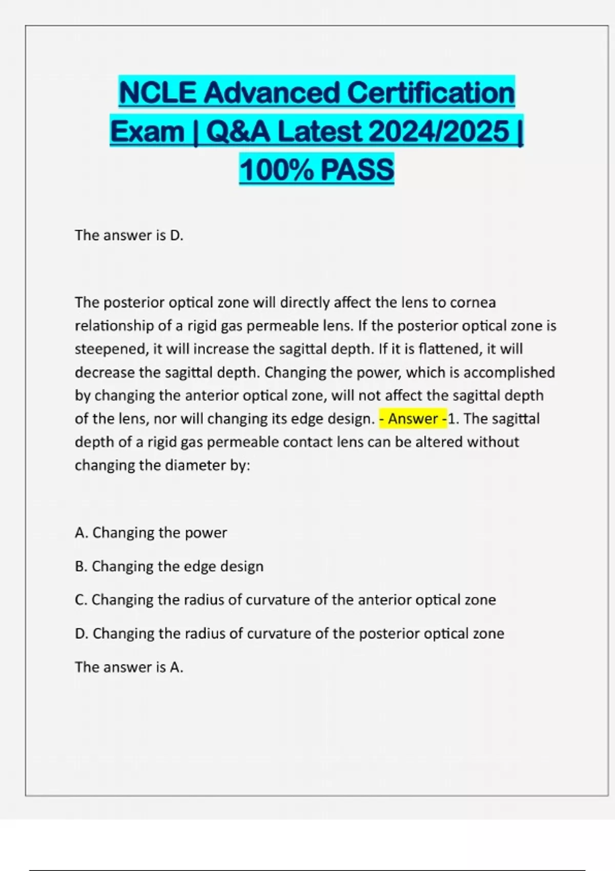 NCLE Advanced Certification Exam | Q&A Latest 2024/2025 | 100% PASS The answer is D. The posterior optical zone will directly affect the lens to cornea relationship of a rigid gas permeable lens. If the posterior optical zone is steepened, it will increase the sagittal depth. If it is flattened, it will decrease the sagittal depth. Changing the power, which is accomplished by changing the anterior optical zone, will not affect the sagittal depth of the lens, nor will changing its edge design. - Answer -1. The sagittal depth of a rigid gas permeable contact lens can be altered without changing the diameter by: A. Changing the power B. Changing the edge design C. Changing the radius of curvature of the anterior optical zone D. Changing the radius of curvature of the posterior optical zone The answer is A.A lens is truncated by removing a segment of the lower edge of a contact lens. This creates a straight edge that interacts with the lower lid and aids in lens positioning. Of the lens designs listed in the question, the only one that requires precise positioning of its optical portions is a translating bifocal lens. - Answer -2. A truncation is used on a rigid gas permeable contact lens to help enhance the performance of which type of design? A. Bifocal B. Aphakic C. Bitoric D. Keratoconus The answer is B.