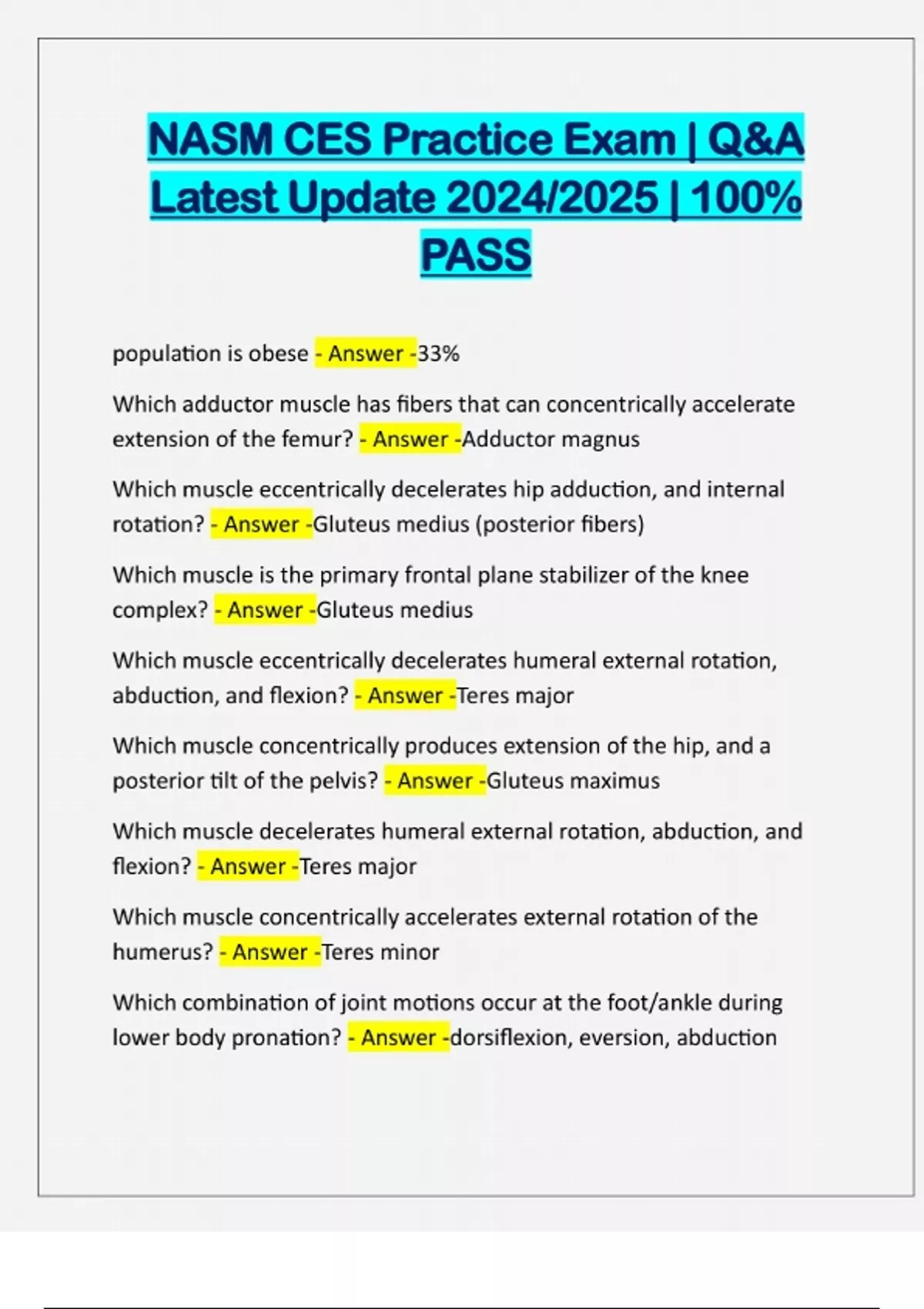 NASM CES Practice Exam | Q&A Latest Update 2024/2025 | 100% PASS population is obese - Answer -33% Which adductor muscle has fibers that can concentrically accelerate extension of the femur? - Answer -Adductor magnus Which muscle eccentrically decelerates hip adduction, and internal rotation? - Answer -Gluteus medius (posterior fibers) Which muscle is the primary frontal plane stabilizer of the knee complex? - Answer -Gluteus medius Which muscle eccentrically decelerates humeral external rotation, abduction, and flexion? - Answer -Teres major Which muscle concentrically produc