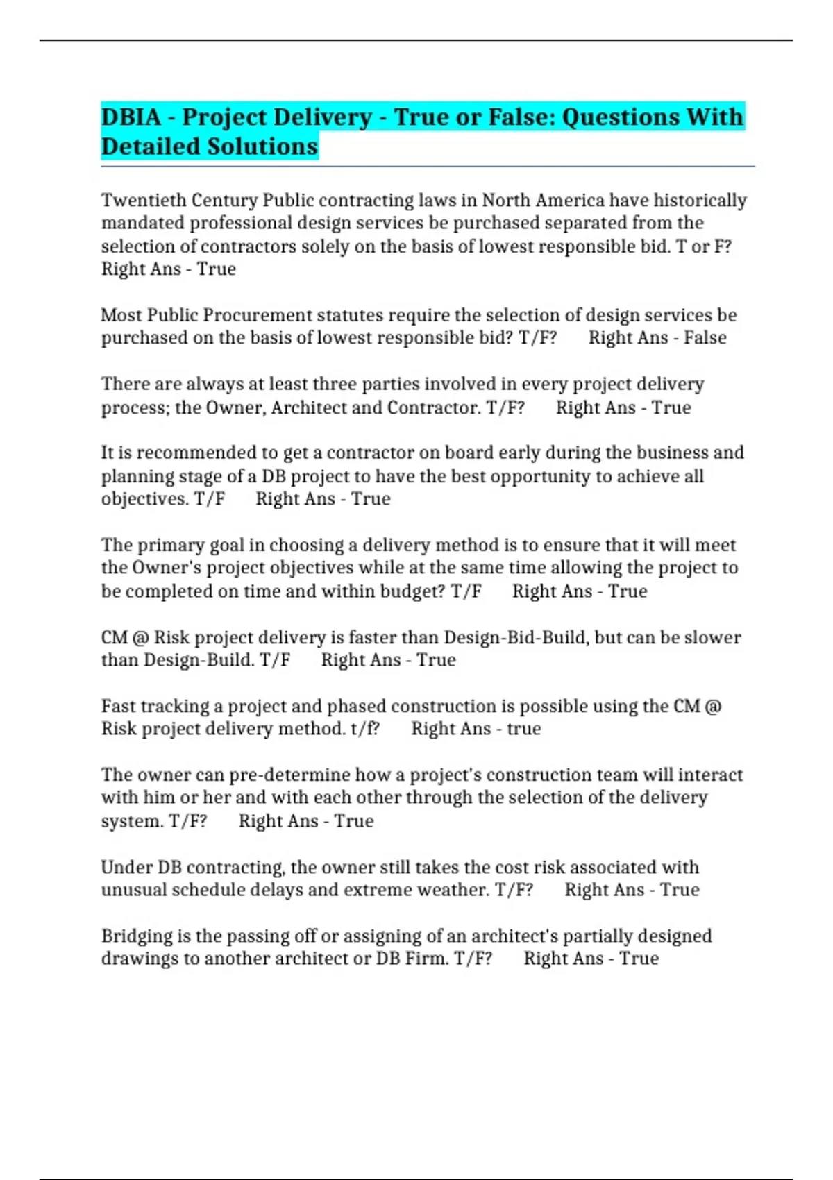 DBIA - Project Delivery - True or False: Questions With Detailed Solutions