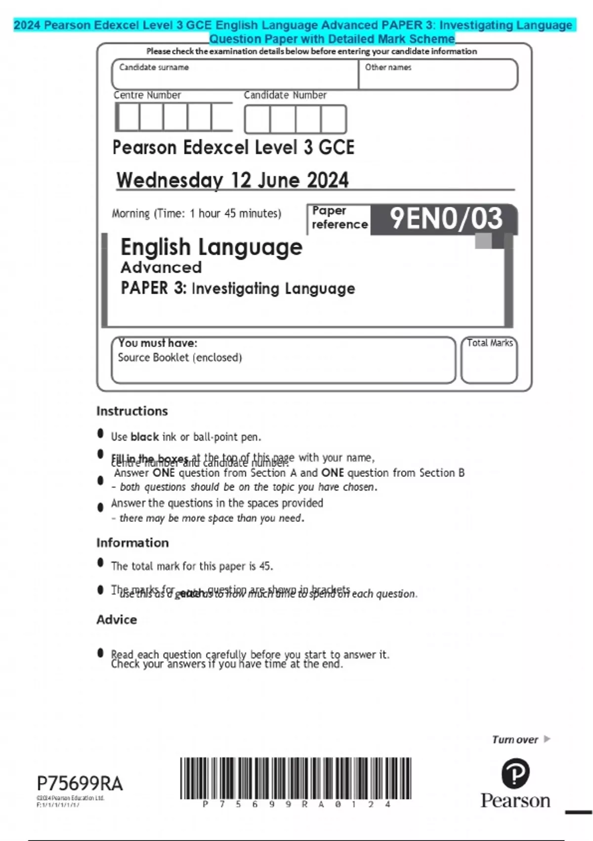 2024 Pearson Edexcel Level 3 GCE English Language Advanced PAPER 3: Investigating Language Question Paper with Detailed Mark Scheme