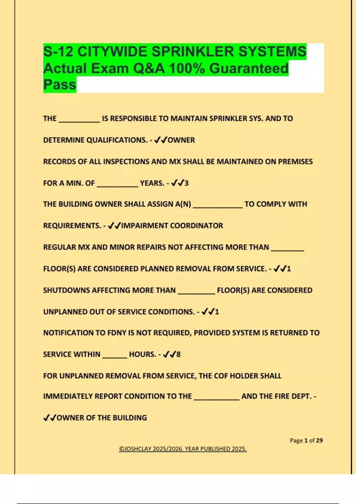S-12 CITYWIDE SPRINKLER SYSTEMS Actual Exam Q&A 100% Guaranteed Pass