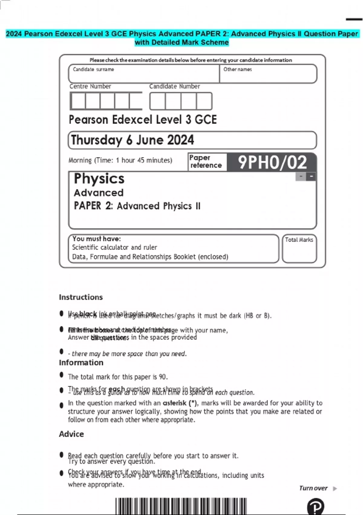 2024 Pearson Edexcel Level 3 GCE Physics Advanced PAPER 2: Advanced Physics II Question Paper with Detailed Mark Scheme