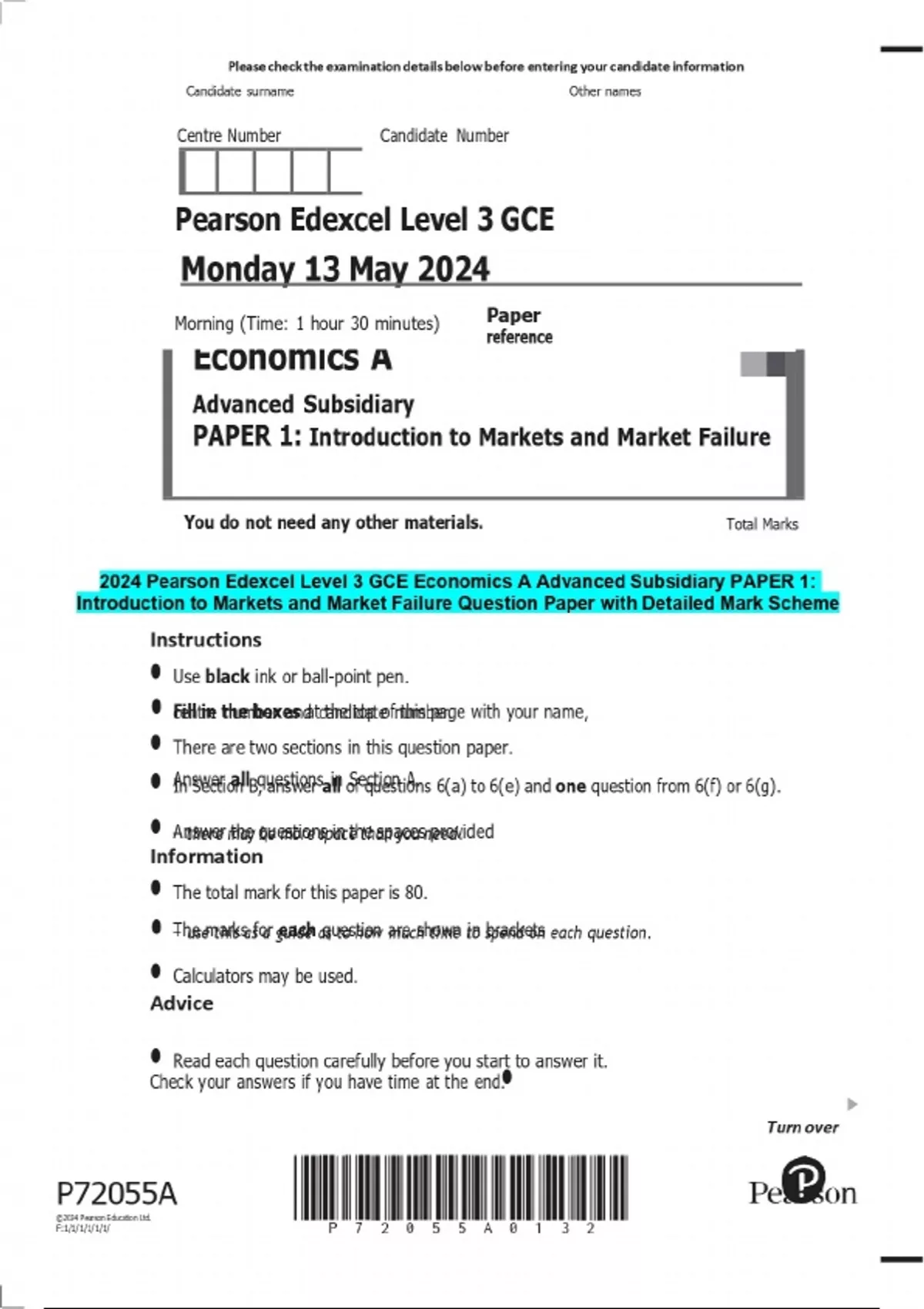 2024 Pearson Edexcel Level 3 GCE Economics A Advanced Subsidiary PAPER 1: Introduction to Markets and Market Failure Question Paper with Detailed Mark Scheme