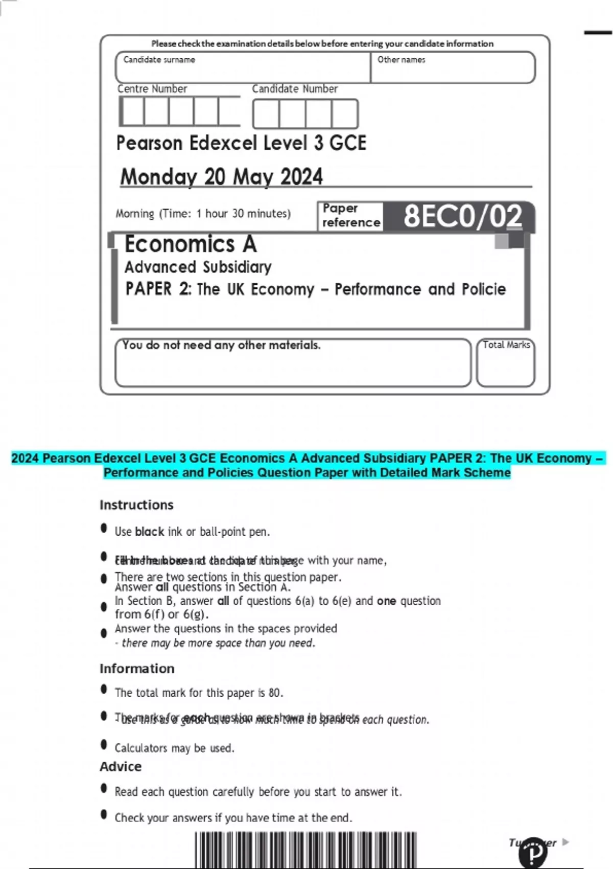 2024 Pearson Edexcel Level 3 GCE Economics A Advanced Subsidiary PAPER 2: The UK Economy – Performance and Policies Question Paper with Detailed Mark Scheme