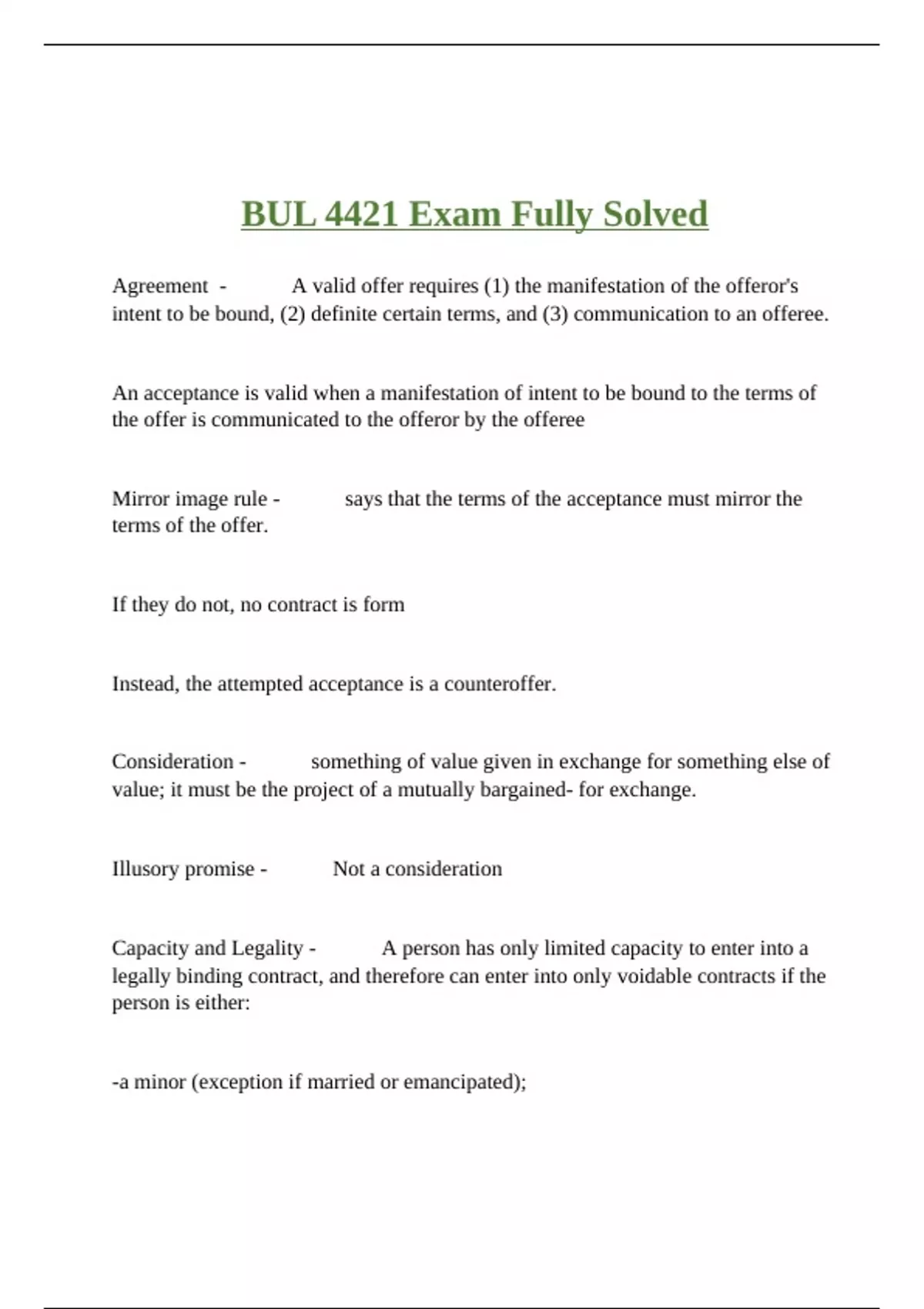 Agreement - A valid offer requires (1) the manifestation of the offeror's intent to be bound, (2) definite certain terms, and (3) communication to an offeree. An acceptance is valid when a manifestation of intent to be bound to the terms of the offer is communicated to the offeror by the offeree Mirror image rule - says that the terms of the acceptance must mirror the terms of the offer. If they do not, no contract is form Instead, the attempted acceptance is a counteroffer. Consideration - something of value given in exchange for something else of value; it must be the project of a mutually bargained- for exchange. Illusory promise - Not a consideration Capacity and Legality - A person has only limited capacity to enter into a legally binding contract, and therefore can enter into only voidable contracts if the person is either: -a minor (exception if married or emancipated); -suffering from a mental deficiency that prevents the person from understanding the nature and obligations of contracts; or -intoxicated Capacity and Legality cont. - Contracts that do not have a legal object because they violate a statute or violate public policy are not valid and deemed void.
