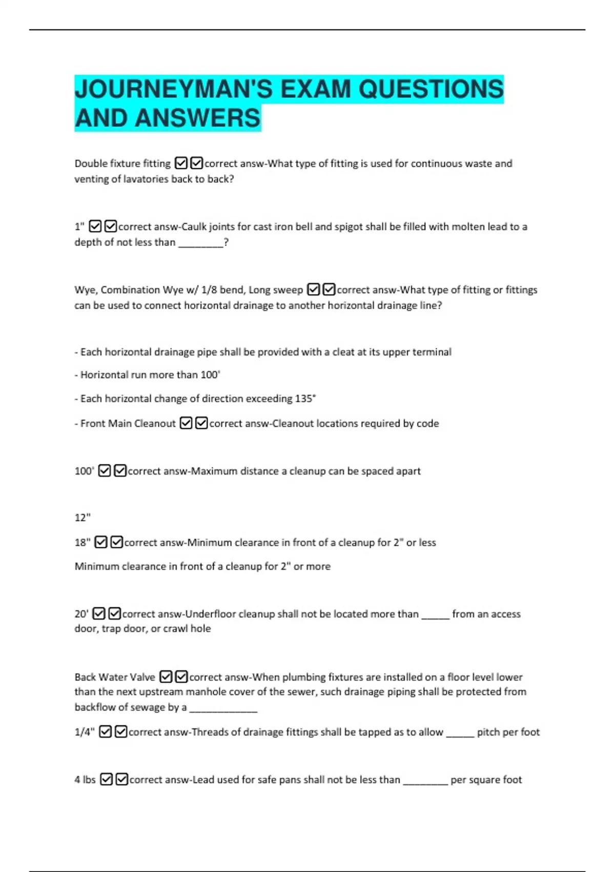 JOURNEYMAN'S EXAM QUESTIONS AND ANSWERS Double fixture fitting correct answ-What type of fitting is used for continuous waste and venting of lavatories back to back? 1" correct answ-Caulk joints for cast iron bell and spigot shall be filled with molten lead to a depth of not less than ________? Wye, Combination Wye w/ 1/8 bend, Long sweep correct answ-What type of fitting or fittings can be used to connect horizontal drainage to another horizontal drainage line?