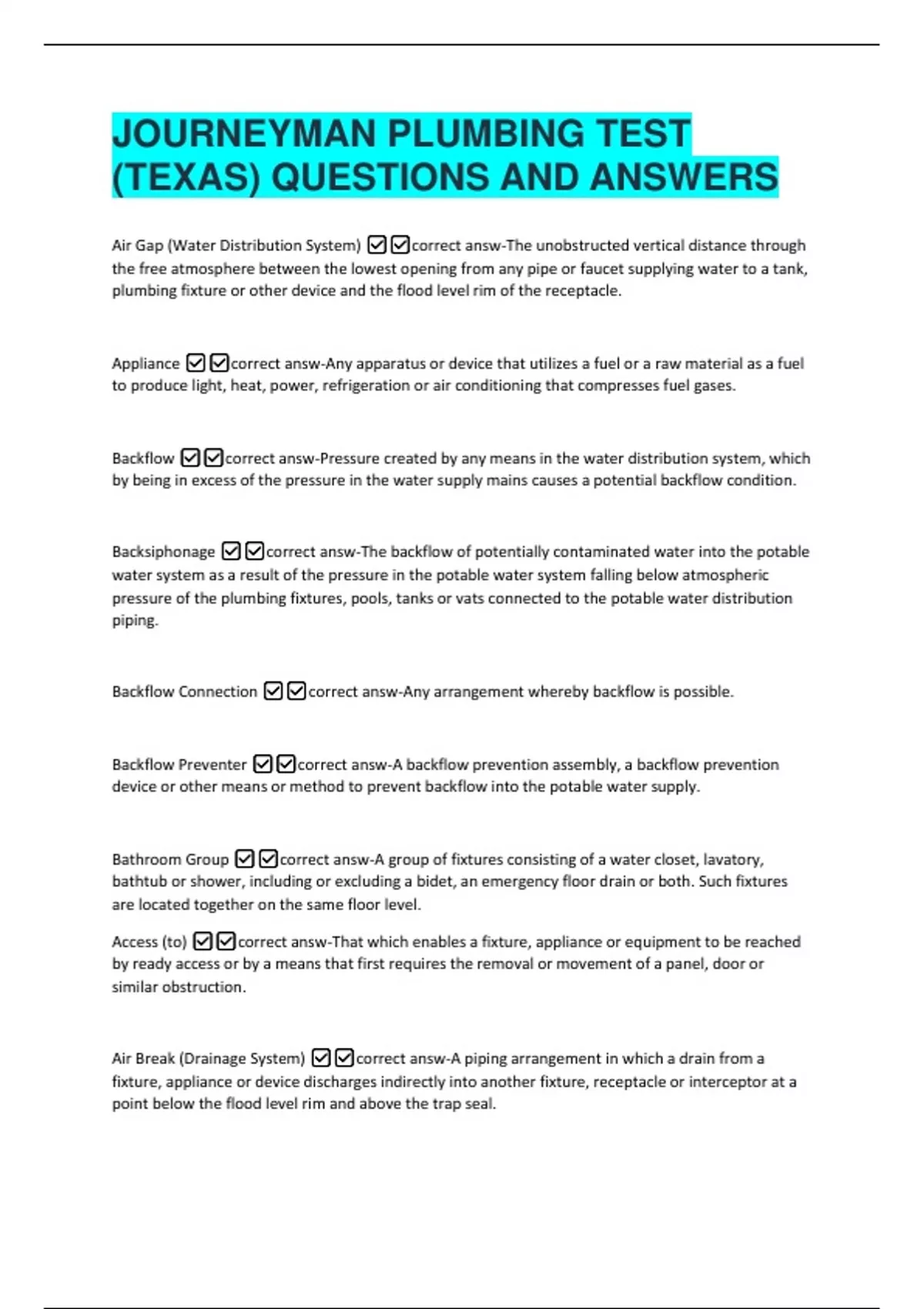 JOURNEYMAN PLUMBING TEST (TEXAS) QUESTIONS AND ANSWERS Air Gap (Water Distribution System) correct answ-The unobstructed vertical distance through the free atmosphere between the lowest opening from any pipe or faucet supplying water to a tank, plumbing fixture or other device and the flood level rim of the receptacle. Appliance correct answ-Any apparatus or device that utilizes a fuel or a raw material as a fuel to produce light, heat, power, refrigeration or air conditioning that compresses fuel gases. Backflow correct answ-Pressure created by any means in the water distribution system, which by being in excess of the pressure in the water supply mains causes a potential backflow condition. Backsiphonage correct answ-The backflow of potentially contaminated water into the potable water system as a result of the pressure in the potable water system falling below atmospheric pressure of the plumbing fixtures, pools, tanks or vats connected to the potable water distribution piping.