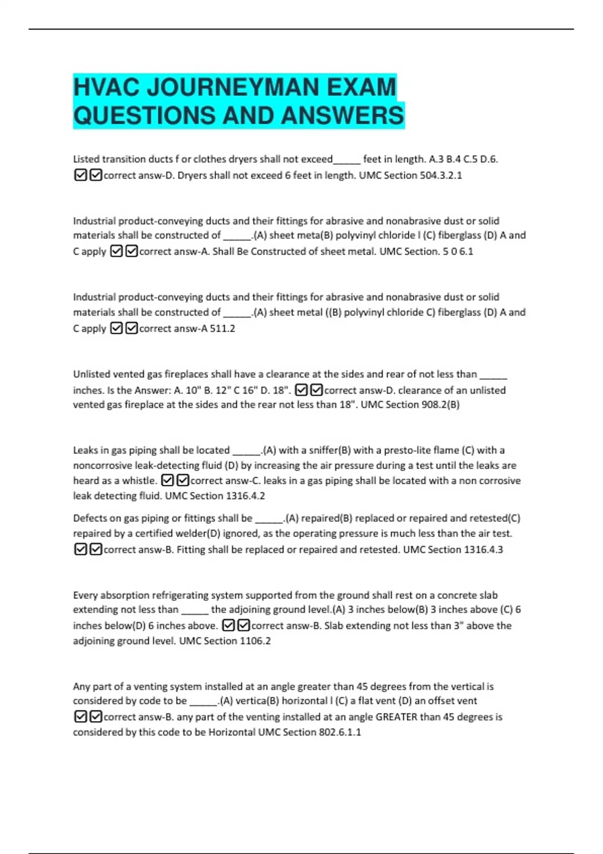 HVAC JOURNEYMAN EXAM QUESTIONS AND ANSWERS Listed transition ducts f or clothes dryers shall not exceed_____ feet in length. A.3 B.4 C.5 D.6. correct answ-D. Dryers shall not exceed 6 feet in length. UMC Section 504.3.2.1 Industrial product-conveying ducts and their fittings for abrasive and nonabrasive dust or solid materials shall be constructed of _____.(A) sheet meta(B) polyvinyl chloride l (C) fiberglass (D) A and C apply correct answ-A. Shall Be Constructed of sheet metal. UMC Section. 5 0 6.1 Industrial product-conveying ducts and their fittings for abrasive and nonabrasive dust or solid materials shall be constructed of _____.(A) sheet metal ((B) polyvinyl chloride C) fiberglass (D) A and C apply correct answ-A 511.2 Unlisted vented gas fireplaces shall have a clearance at the sides and rear of not less than _____ inches. Is the Answer: A. 10" B. 12" C 16" D. 18". correct answ-D. clearance of an unlisted vented gas fireplace at the sides and the rear not less than 18". UMC Section 908.2(B)
