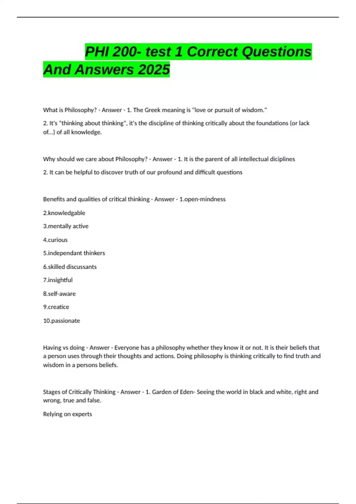 PHI 200- test 1 Correct Questions And Answers 2025
