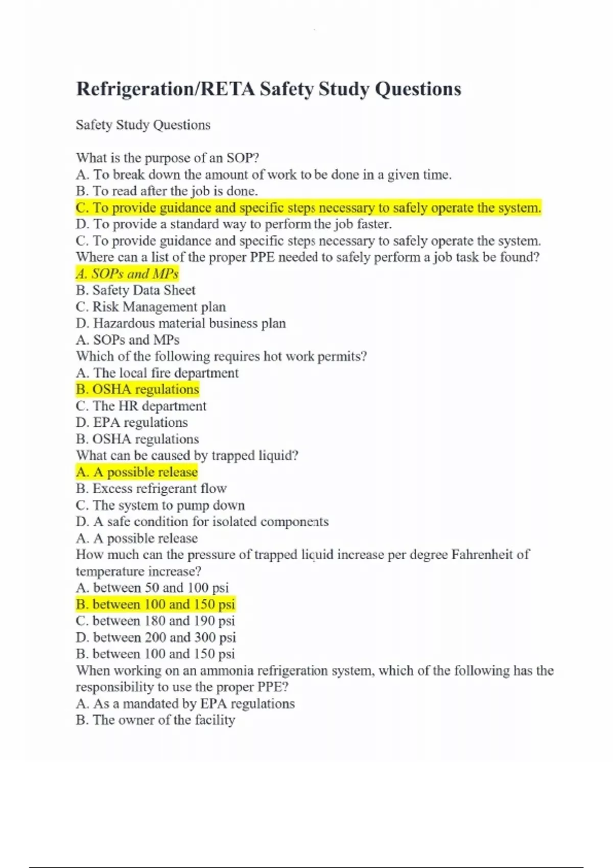 Refrigeration/RETA Safety Study Questions Safety Study Questions What is the purpose of an SOP? A. To break down the amount of work to be done in a given time. B. To read after the job is done. C. To provide guidance and specific steps necessary to safely operate the system. D. To provide a standard way to perform the job faster. C. To provide guidance and specific steps necessary to safely operate the system. Where can a list of the proper PPE needed to safely perform a job task be found? A. SOPs and MPs B. Safety Data Sheet C. Risk Management plan D. Hazardous material business plan A. SOPs and MPs Which of the following requires hot work permits? A. The local fire department B. OSHA regulations C. The HR department D. EPA regulations B. OSHA regulations What can be caused by trapped liquid? A. A possible release